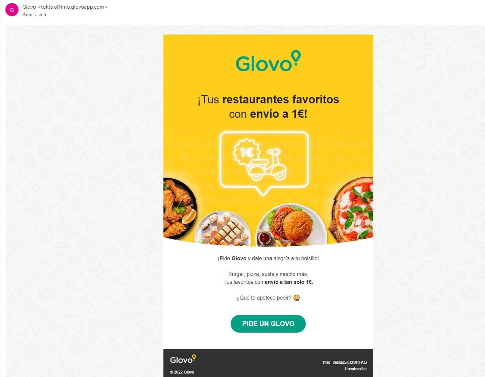 En este correo electrónico de Glovo se incluye un call to action directo, que se ve a simple vista y llama la atención. Además, es el único CTA de un correo electrónico visualmente atractivo y con poco texto, en el que todo el diseño apunta directamente a la llamada a la acción.