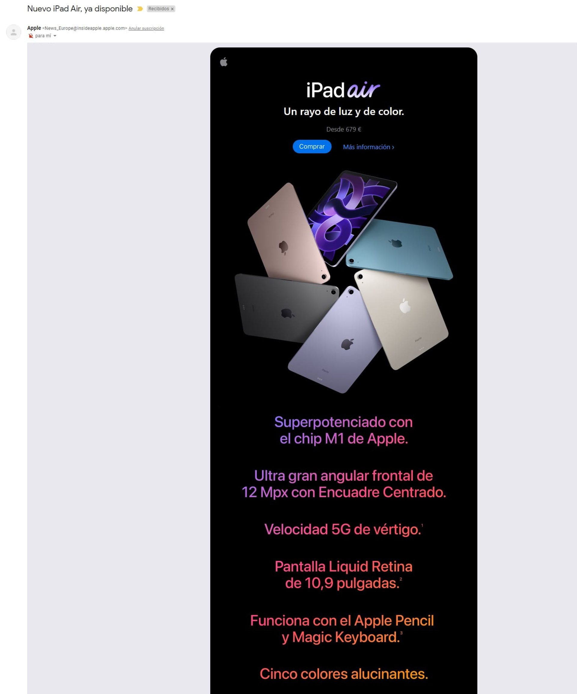 Siempre que presentes algún producto por email, hazlo de forma atractiva y original. No tiene por qué ser una foto sencilla del producto (estilo catálogo), sino que puedes hacer algo creativo, tal como hace Apple en este correo electrónico.