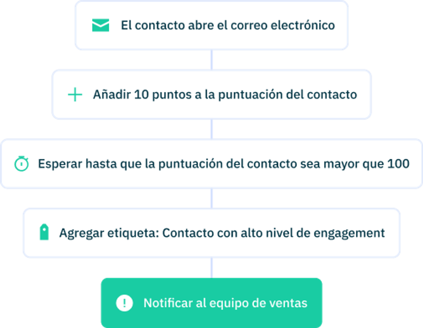 - Te permite crear campañas específicas para los contactos más interesados. Una vez que un contacto alcanza cierto puntaje, puedes programar una automatización para enviarle más información o incluso aprovechar la oportunidad para hacerle una oferta tentadora.