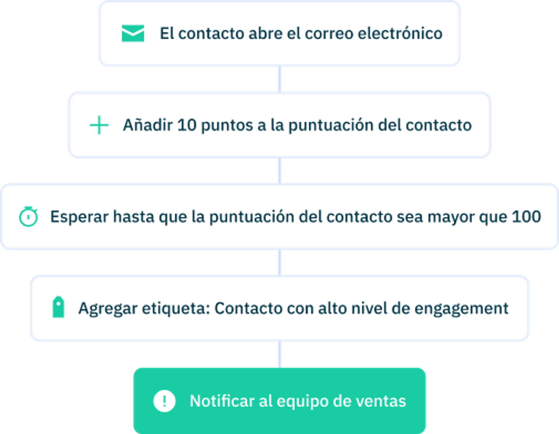 - Informa a tu equipo sobre los leads con mayor potencial de compra inminente. Cuando un contacto llegue a cierto puntaje, envía una notificación automática a tu equipo para que hagan un seguimiento de aquellos leads que tienen mayor probabilidad de adquirir tus productos o servicios pronto.