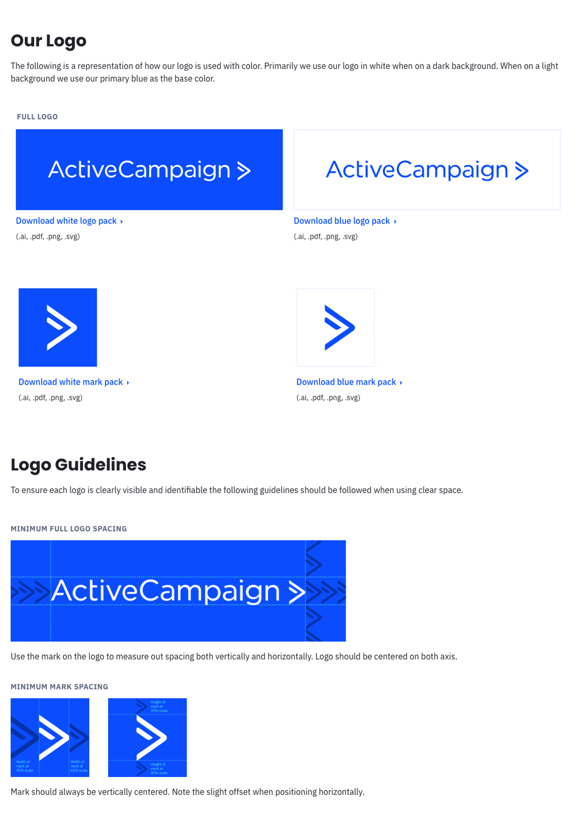 El manual de identidad de marca te servirá de guía para aplicar tu identidad visual. ActiveCampaign pauta cómo tienen que ser y utilizarse elementos visuales como el logotipo. Fuente: ActiveCampaign.