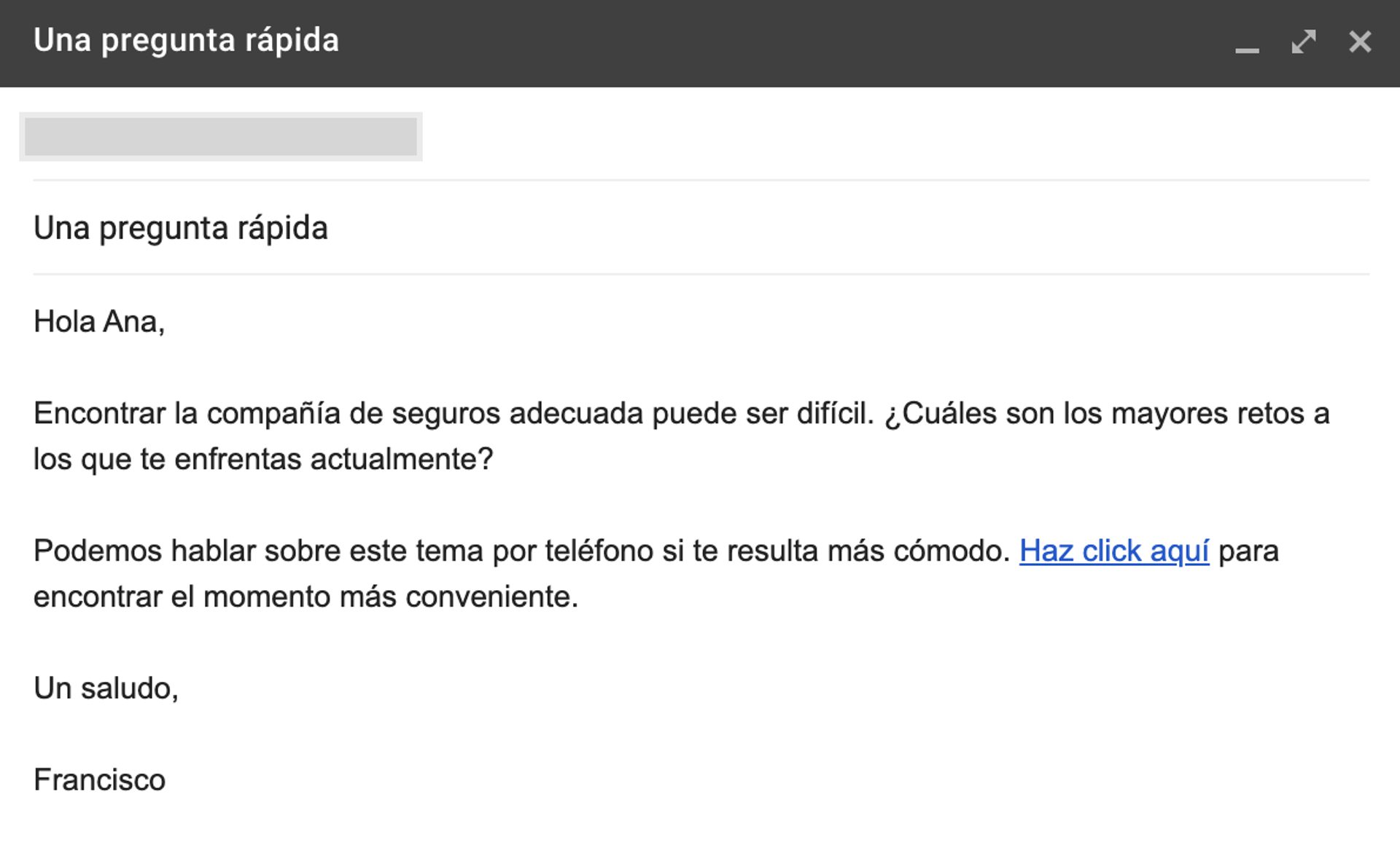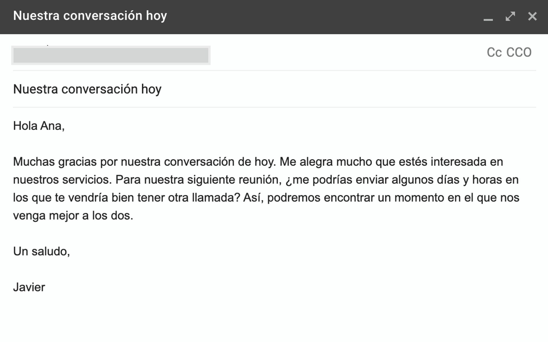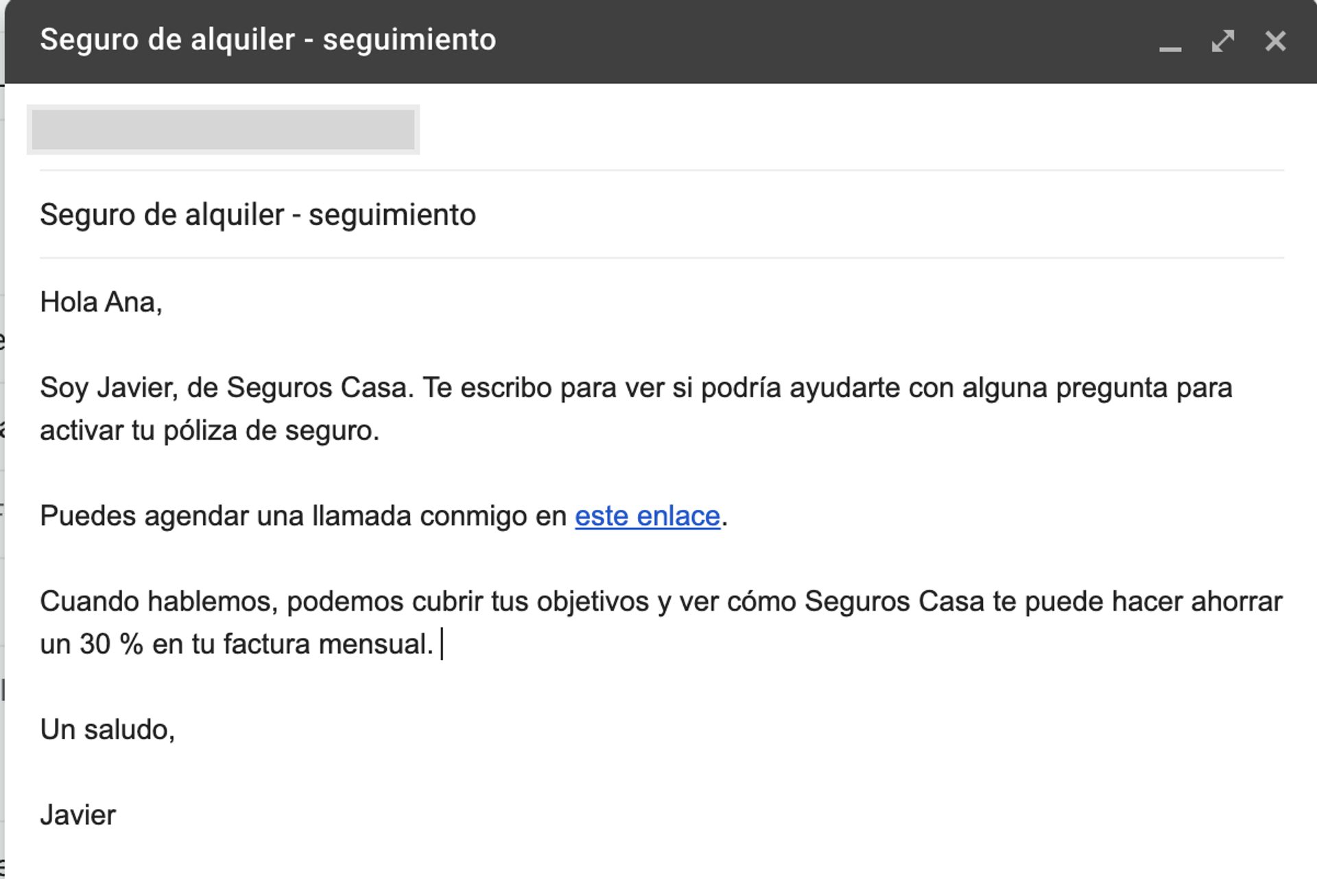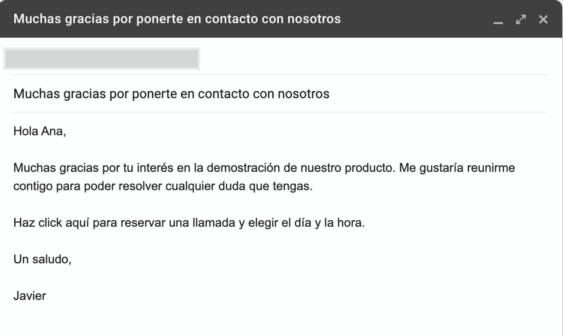 La primera mitad de este correo electrónico es similar a la plantilla de divulgación inicial: Javier abre con una oferta para ayudar a responder las preguntas de Ana e incluye el enlace de reserva para programar una hora.
