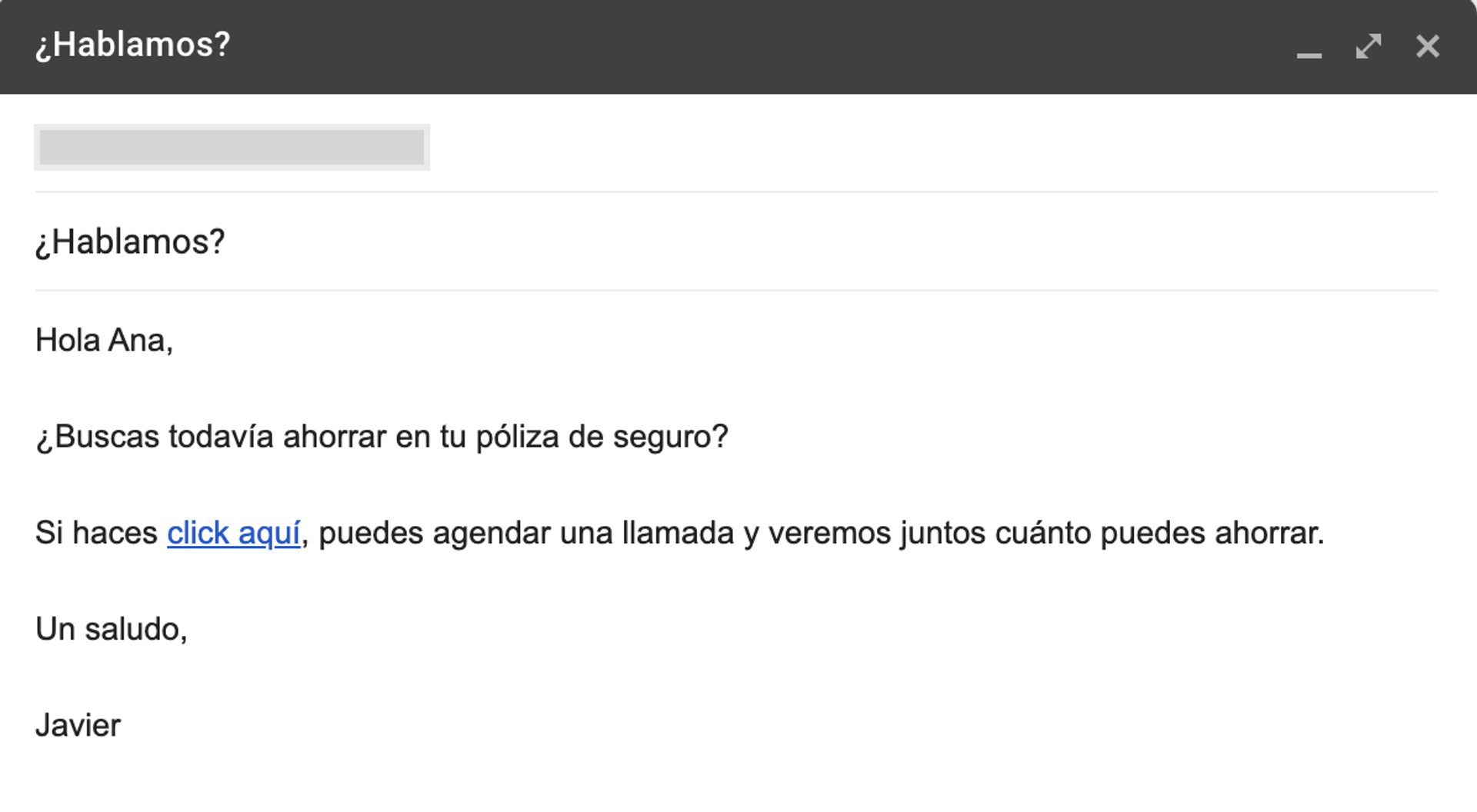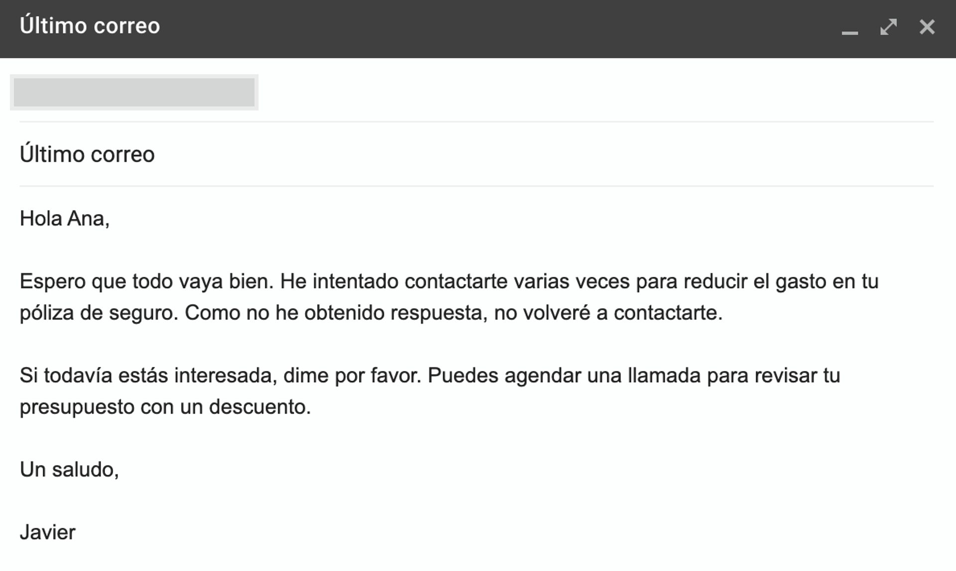 A veces, una plantilla de correo electrónico de ventas sin personalizar como la anterior puede parecer demasiado genérica. Para ayudar a aclarar la ejecución, proporcionamos capturas de pantalla de correos electrónicos ficticios entre nuestro querido representante de ventas, Javier, y su cliente potencial Ana.