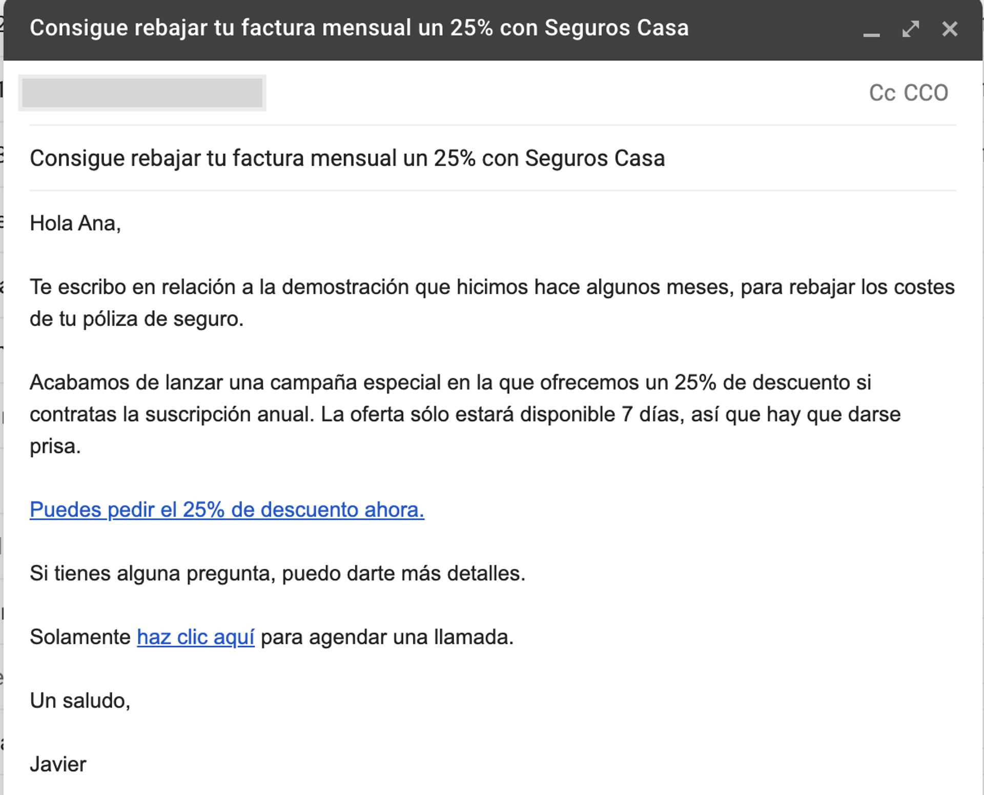 Esta vez, la propuesta de valor es clara: cuando hablen, Javier le mostrará a Ana cómo el plan puede ahorrarle un 30 % en sus facturas mensuales. Una oferta como esa puede hacer maravillas en cuanto al compromiso de Ana con la cita agendada.