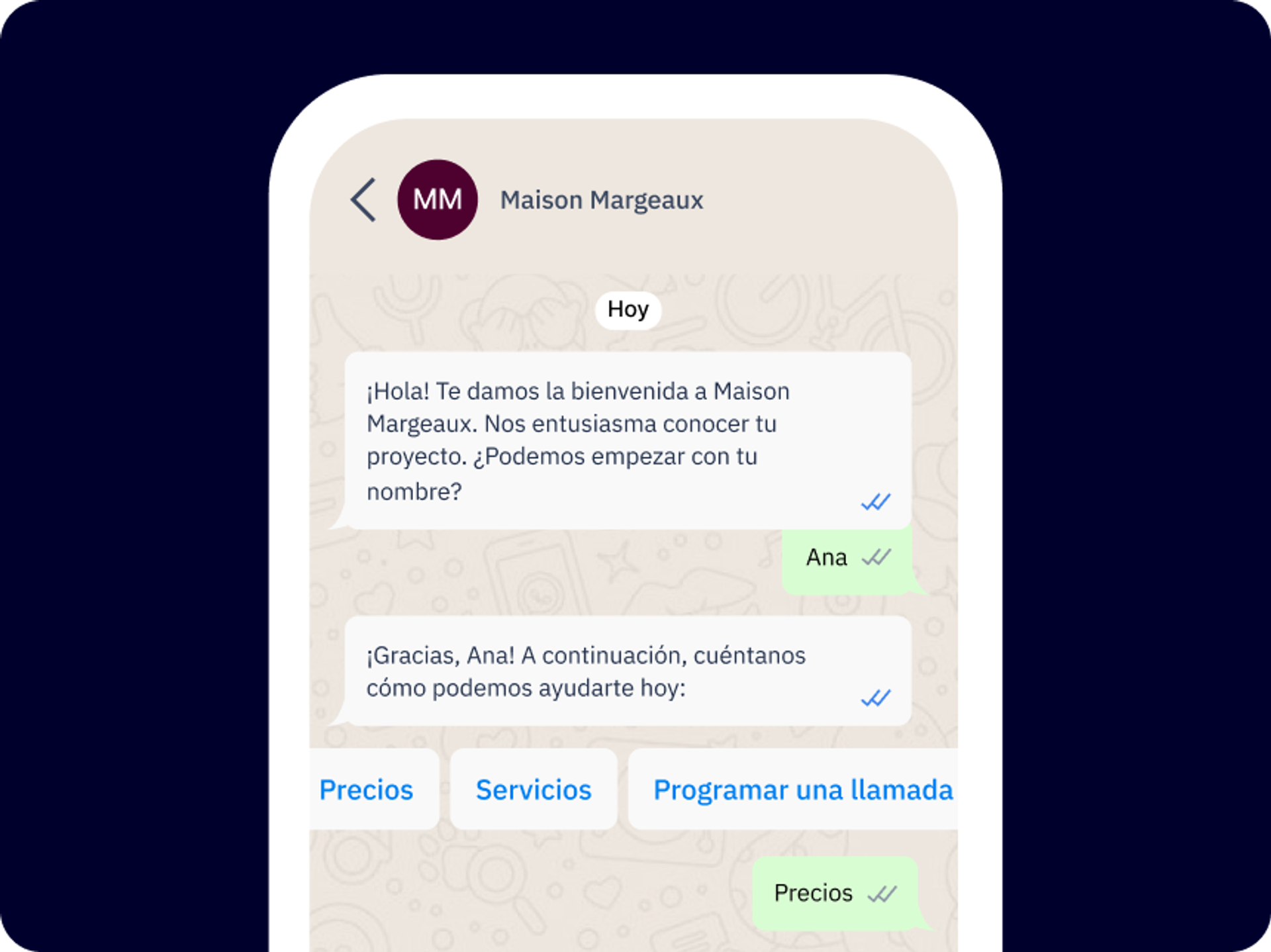 Empieza a automatizar una vez que comprendas las preguntas más frecuentes de tus clientes. Por ejemplo, si los clientes potenciales preguntan constantemente sobre los precios, crea una respuesta automática que proporcione esta información y los invite a continuar la conversación para obtener recomendaciones personalizadas.
