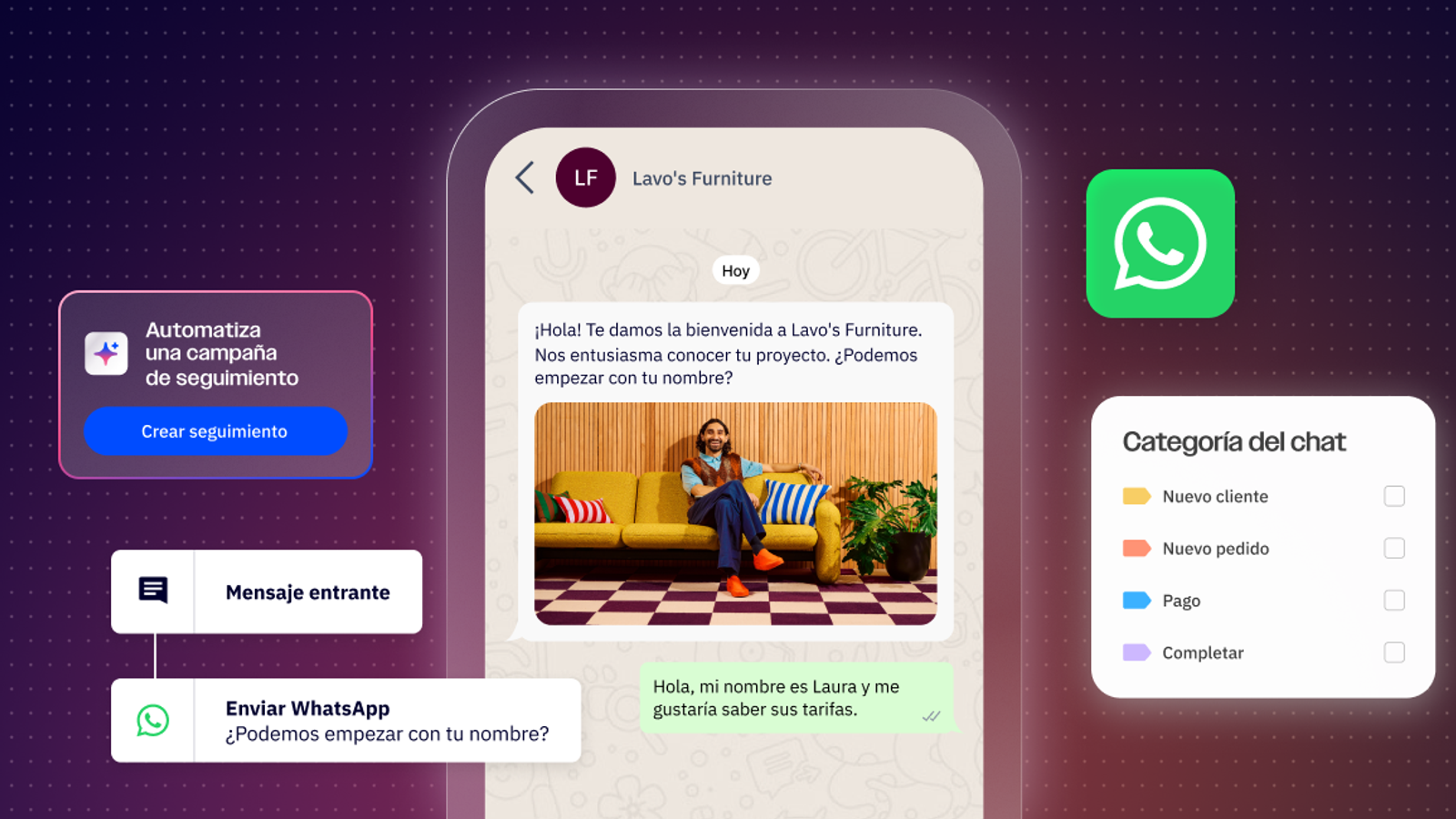 Con la API de WhatsApp, puedes enviar o recibir información de cualquier base de datos, sistema de planificación de recursos empresariales o CRM conectados donde almacenas los datos de tus clientes. Esto te permite personalizar todas las comunicaciones con tus clientes en función de cada persona y retomar una conversación con todos los detalles justo donde la dejaste.