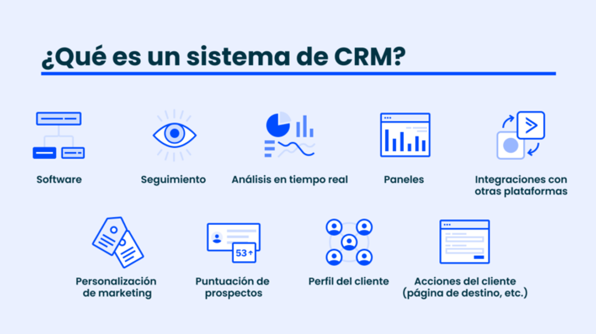 Un CRM se integra con otras plataformas y herramientas, y te permite hacer un seguimiento y obtener un panorama completo de lo que hacen tus clientes en línea y fuera de línea, de modo que puedas crear mejores experiencias para tus clientes y prospectos.