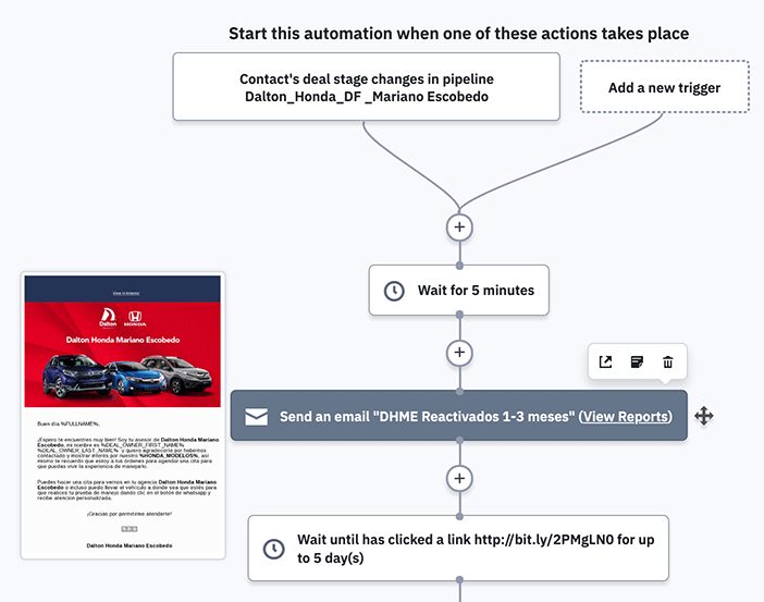 Miguel comenta que es crucial centralizar la información sobre prospectos en una sola herramienta, porque las campañas de correo electrónico personalizadas de Dalton se desencadenan dentro del CRM. Dalton crea automatizaciones que envían correos electrónicos de seguimiento a un cliente cuando pasa de una etapa de oportunidad de venta a otra dentro de un embudo de ventas.