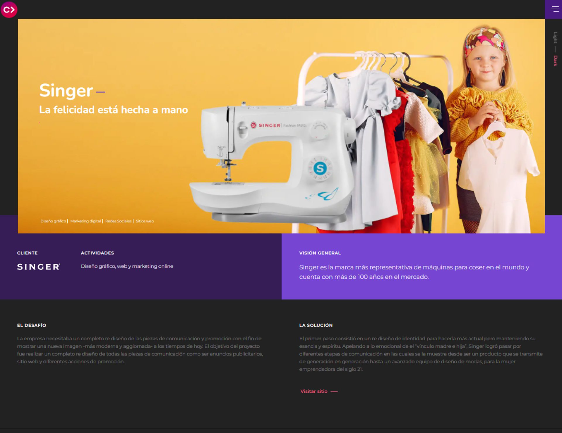 Creativedog es una agencia de marketing digital que trabajó con Singer, la marca más representativa de máquinas de coser del mundo, para modernizar la imagen de la marca y adaptarla a los tiempos de hoy. Para conseguirlo, Creativedog recurrió a diferentes tipos de contenido que mostraban situaciones de la vida moderna.
