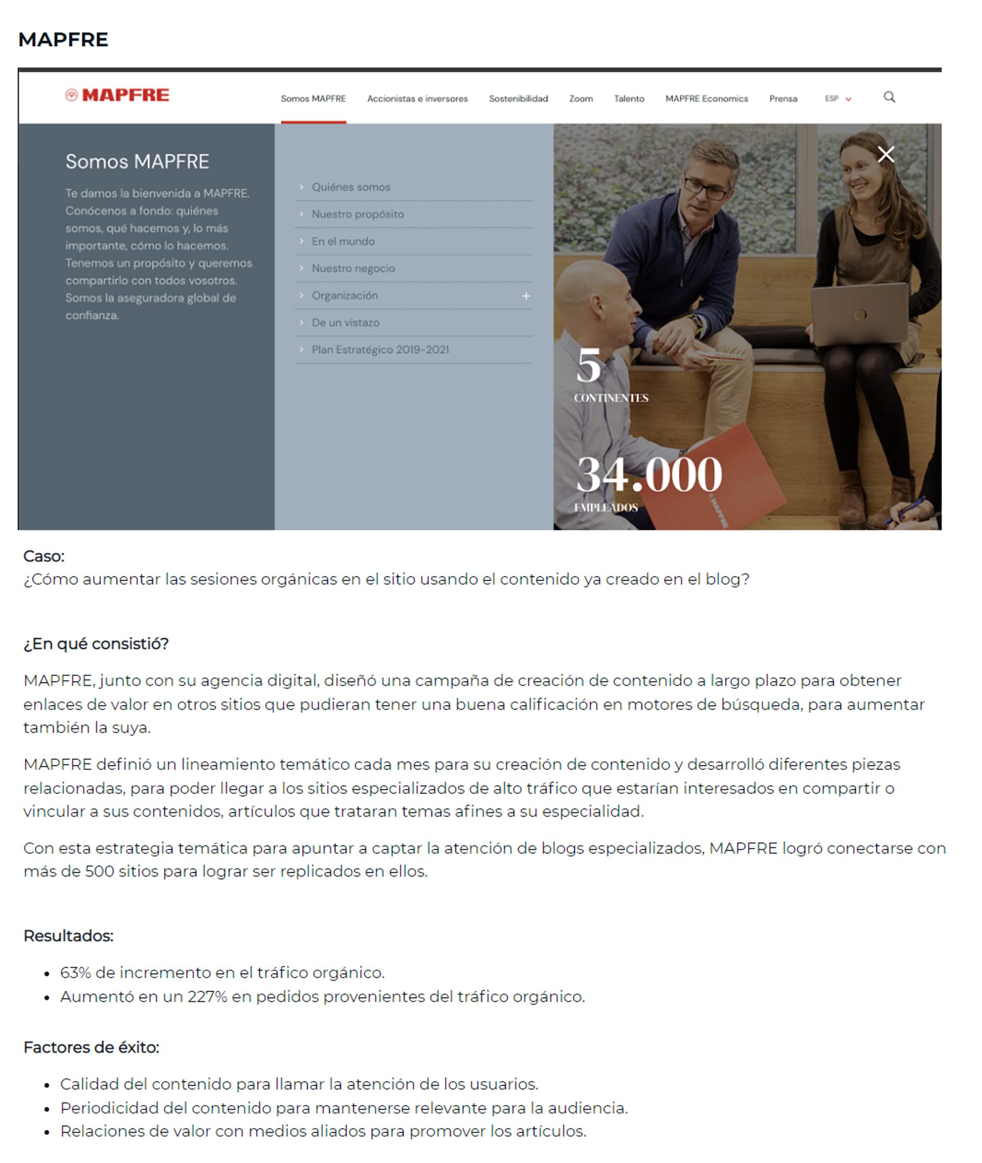 En él se desglosa la estrategia de SEO de Mapfre, con detalles sobre cómo aumentaron el tráfico orgánico en un 63 %, mientras que los pedidos provenientes de dicho tráfico aumentaron un 277 %.