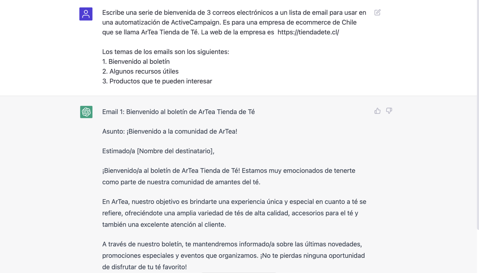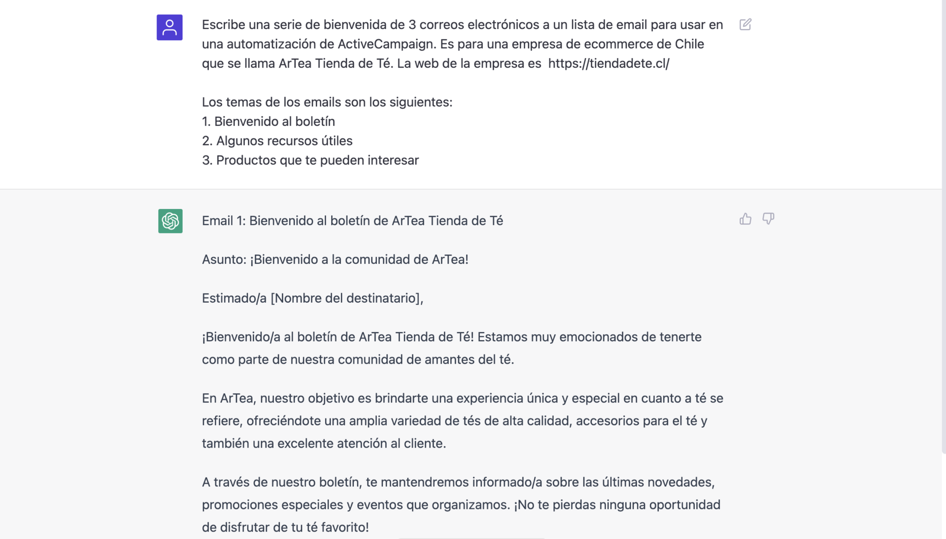 Para crear una serie de correos de bienvenida, le pedimos a ChatGPT que escriba un número concreto de correos electrónicos para nuestra serie. En este caso le pedimos tres. Le damos más detalles como el nombre de la empresa y la página web para que pueda añadirlos en el contenido de los correos electrónicos. Cuanto más específico es el contenido que compartimos con ChatGPT, mejores son los resultados que obtenemos. En el ejemplo hemos usado una empresa chilena que se dedica a la venta de té, ArTea.