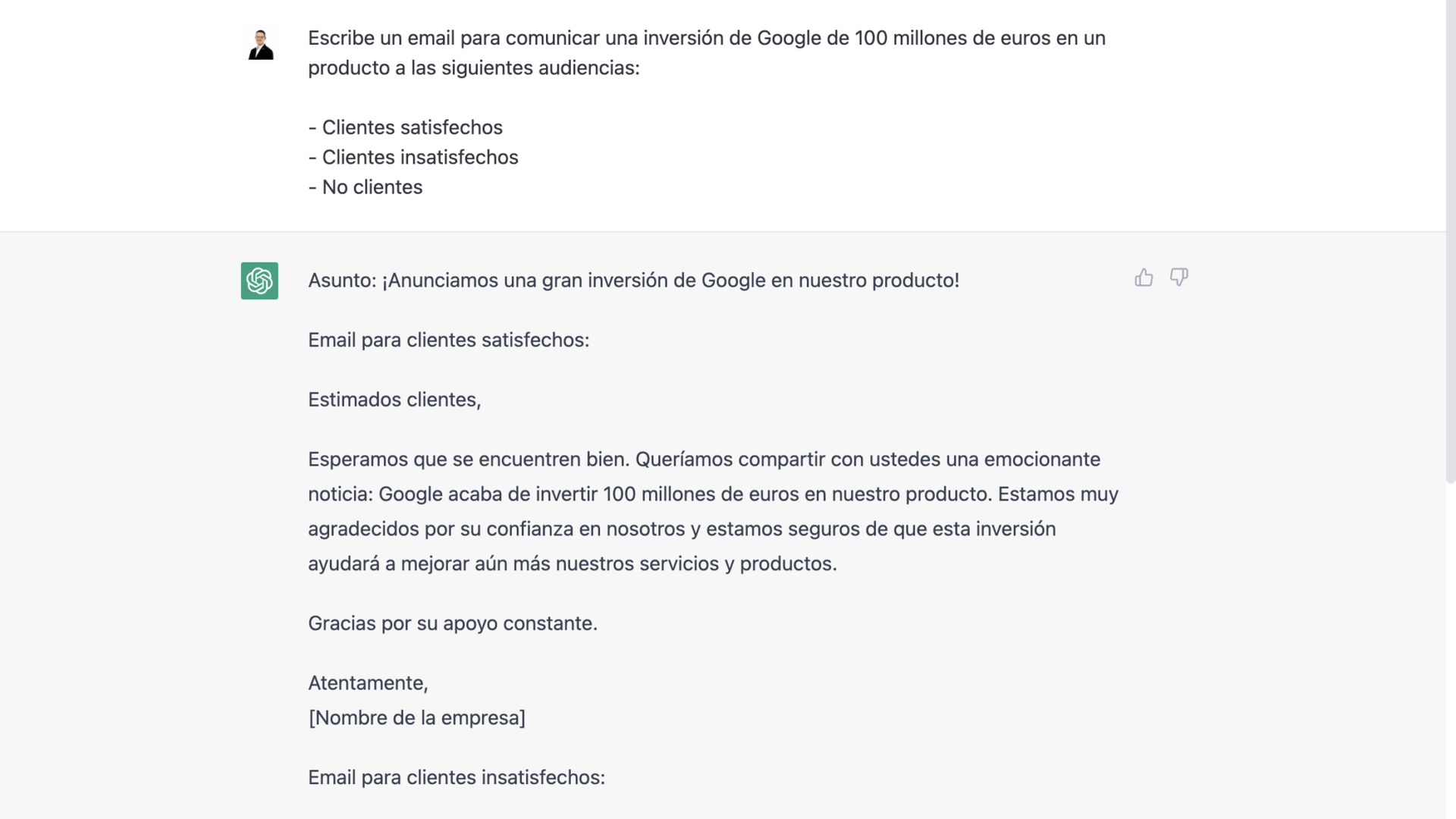 En este caso le hemos pedido a ChatGPT que comunique una inversión de Google en un producto y que la comunique por correo electrónico a diferentes audiencias.