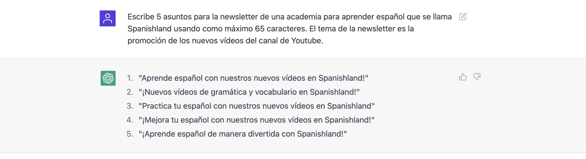 Una de las funciones que nos permite usar ChatGPT es generar múltiples líneas de asunto. Esto lo podemos aprovechar para realizar pruebas A/B.