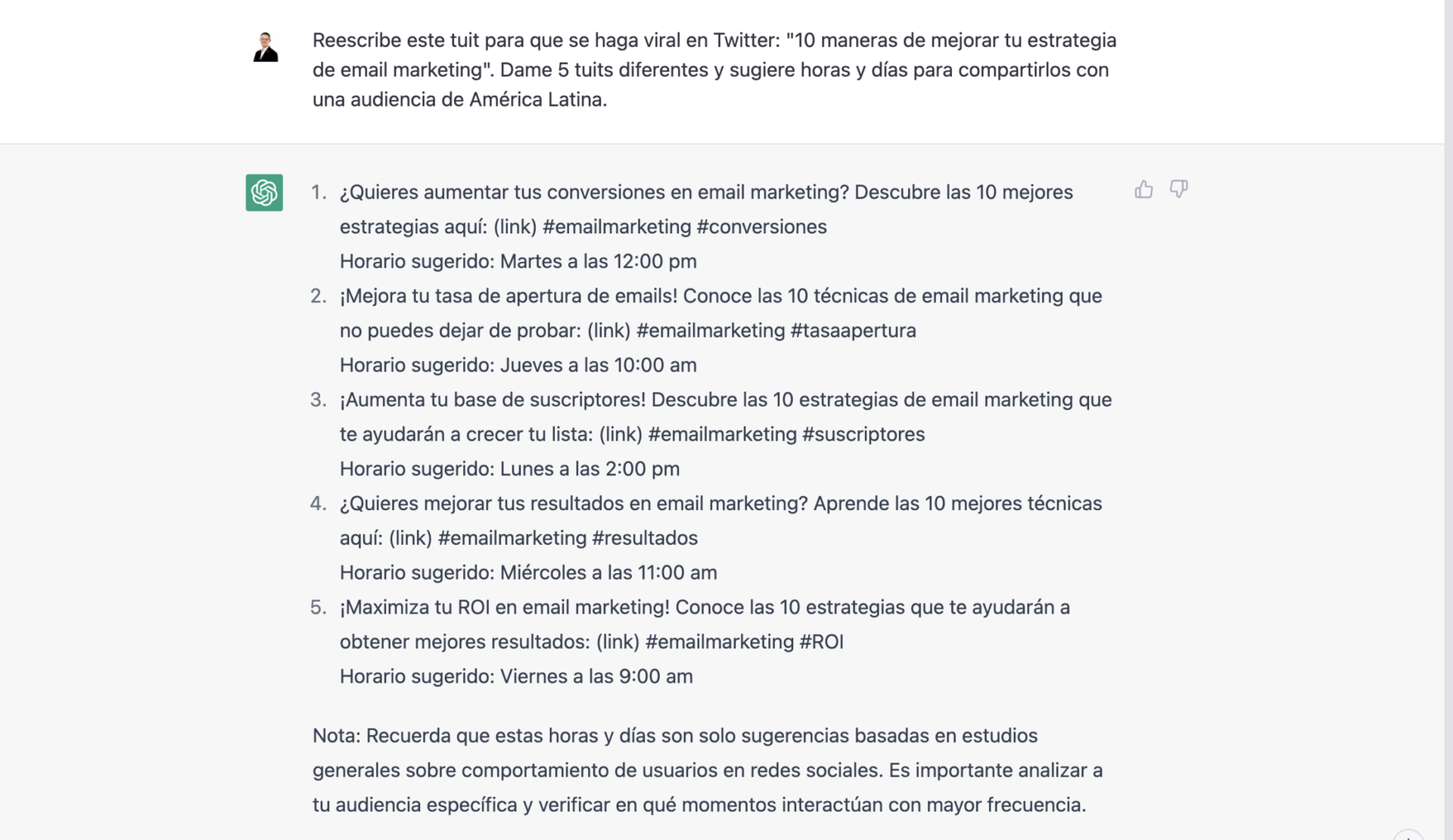 Tus redes sociales pueden ser uno de los grandes beneficiados de la irrupción de ChatGPT. Las ideas para compartir mejor tu contenido no solo se limitan a los textos, sino que ChatGPT te puede ayudar también con los días y horas más adecuados para compartir tu contenido. En este ejemplo, hemos pedido a ChatGPT un contenido para que se haga viral en Twitter, pero podríamos aplicar instrucciones similares a otras redes sociales como Facebook, LinkedIn o Instagram.