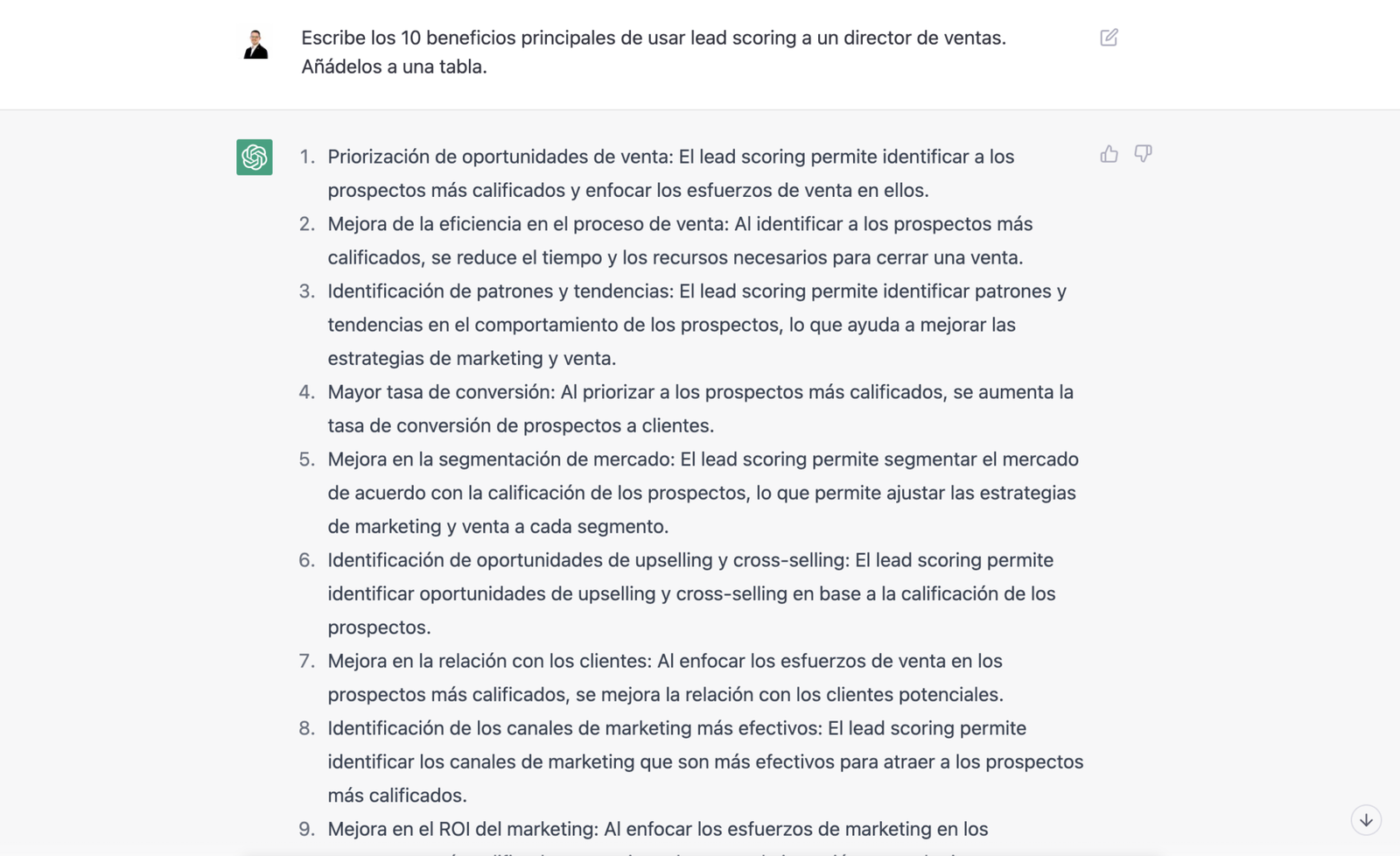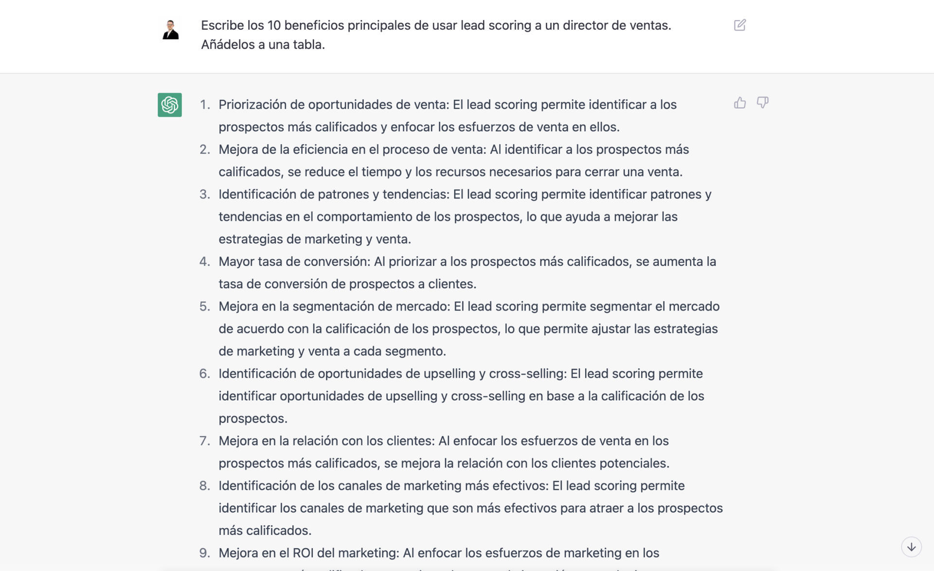 Imaginemos que tenemos que lanzar una nueva landing page sobre los beneficios del lead scoring y nuestra audiencia ideal son directores de ventas. Cuando personalizamos la audiencia objetivo, los resultados de ChatGPT cambian mucho. Si le pidiéramos que explique qué es lead scoring a un niño de dos años o a una persona de 80 nos dará contenido más acorde al público objetivo. También podríamos pedirle que le explique el mismo contenido a un premio Nobel.