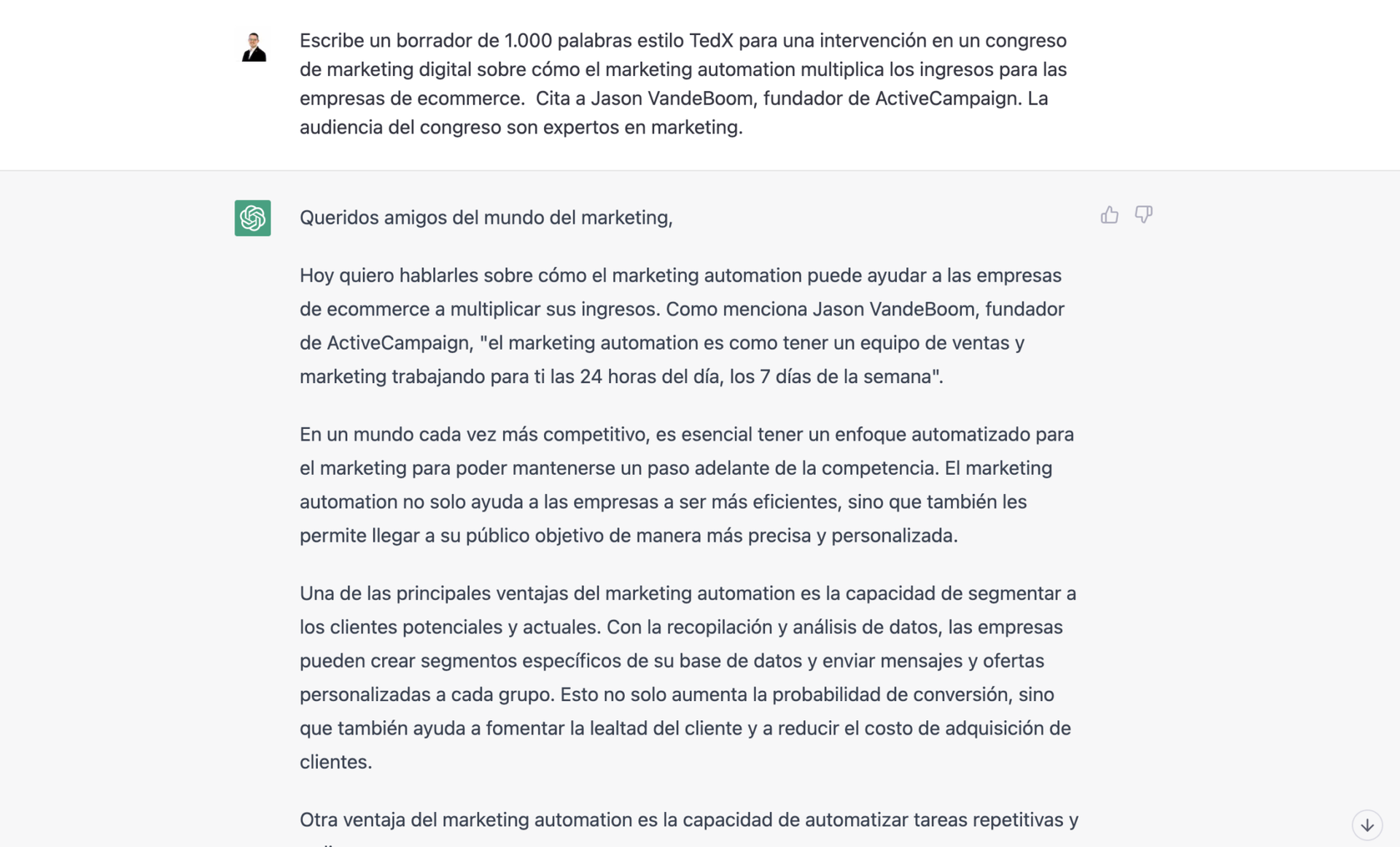 Un borrador para hablar en público en el que establezcas el número de palabras, tu público objetivo e incluso las personas que quieres citar puede ahorrarte mucho tiempo. Puedes incluir incluso el estilo que deseas, en este caso TedX, pero podrías pedirle a ChatGPT que usara el estilo de un determinado personaje público.