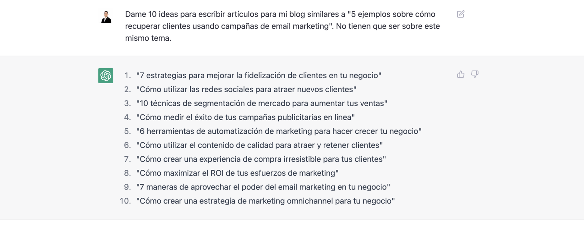 En cambio, si queremos escribir contenido original y estamos buscando ideas podemos pedir a ChatGPT que nos dé sugerencias sobre un contenido concreto. En este caso, hemos elegido uno de los contenidos que más tráfico tiene del blog en español de ActiveCampaign, 5 ejemplos sobre cómo recuperar clientes usando campañas de email marketing. Le hemos pedido que nos dé 10 ideas, especificando que no sean sobre este mismo tema. Si no hubiésemos especificado que fueran de un tema distinto, nos habría dado variaciones de ese mismo tema.