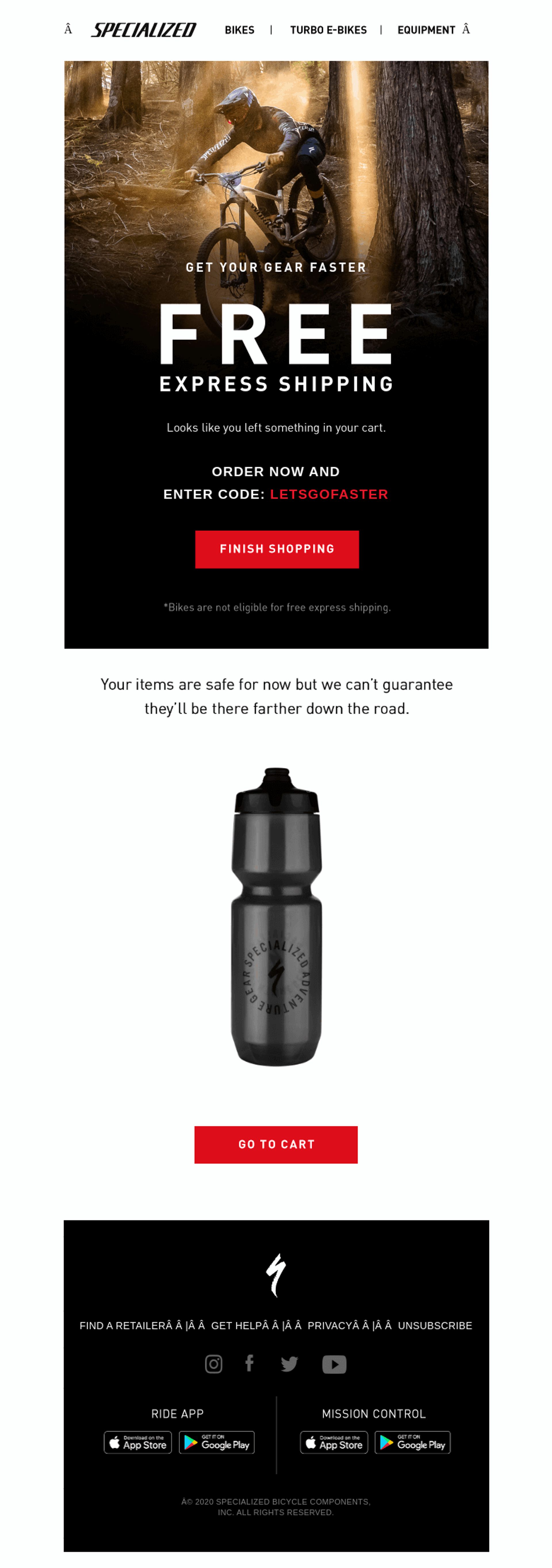 3. Specialized: ejemplo de email de carrito abandonado que ofrece envío gratuito