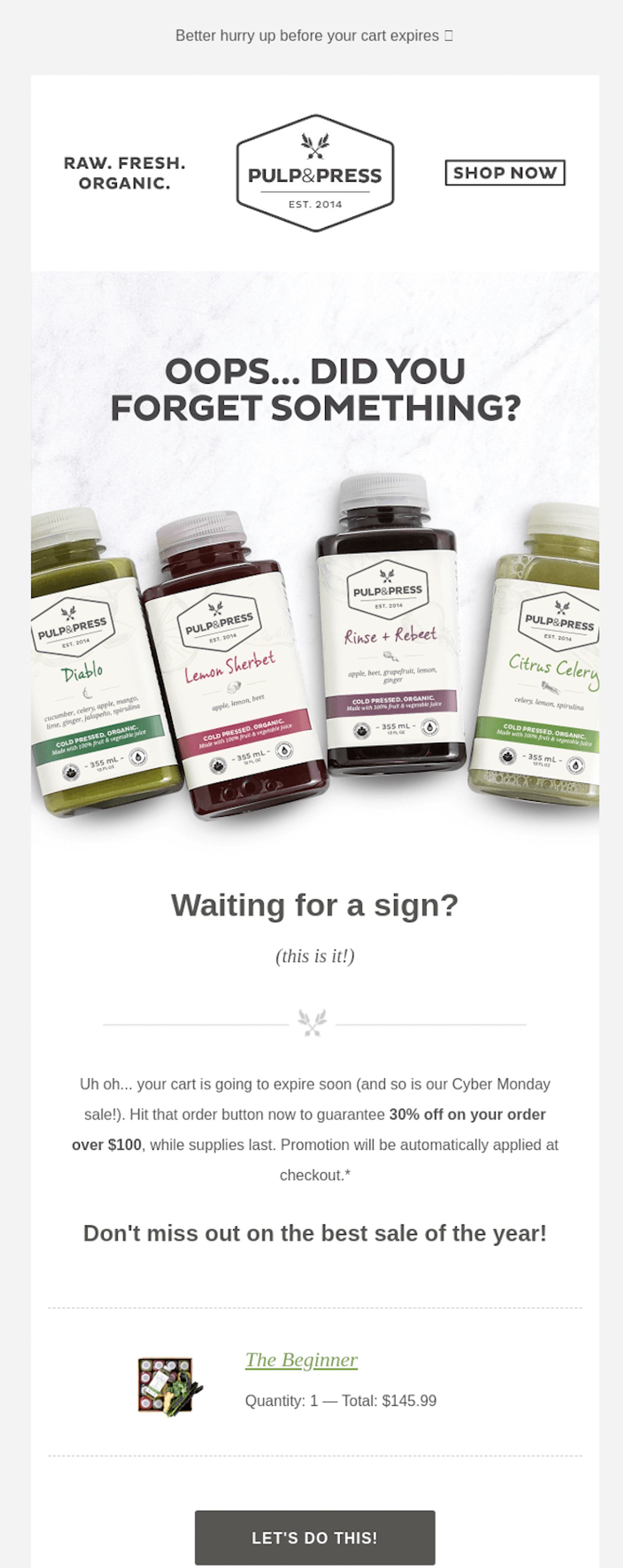 Ofrecer códigos de descuento o cupones es otra buena opción para alentar a los clientes a finalizar sus compras. Y es justo lo que hace la empresa Pulp & Press en su correo electrónico de carrito abandonado.