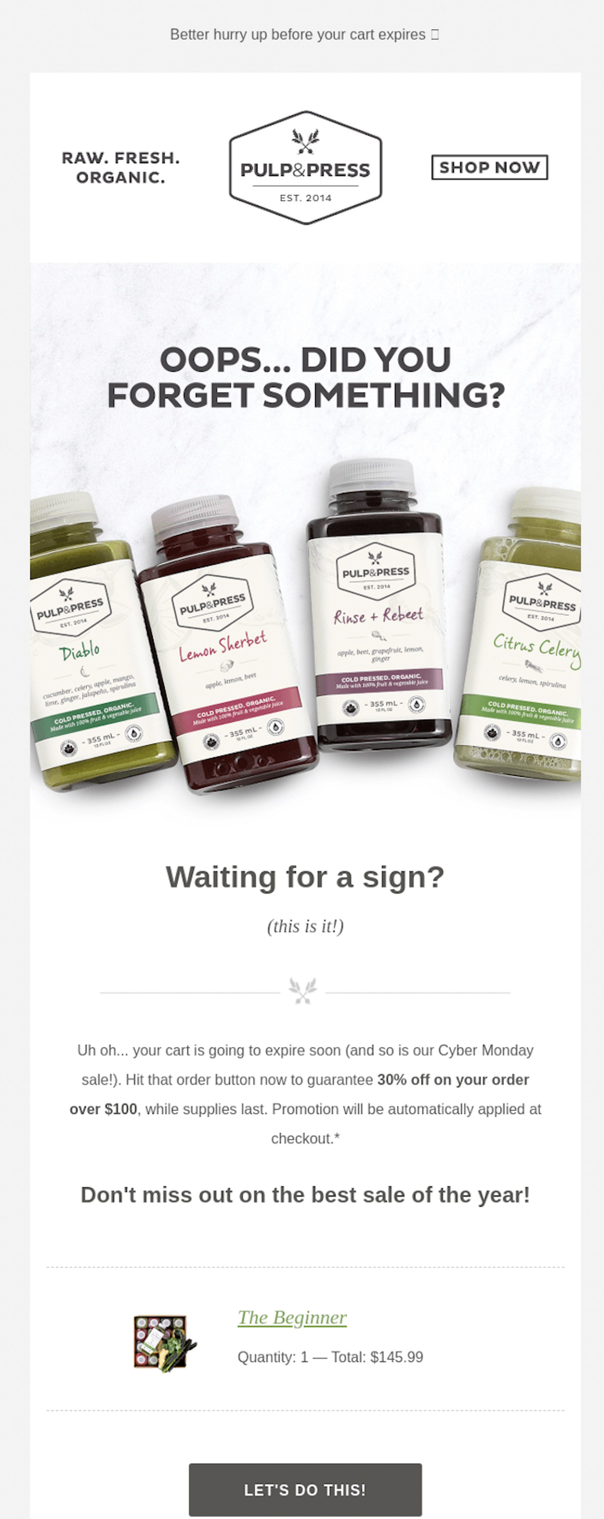 Fuente: email de carrito abandonado de Pulp & Press a través de reallygoodemails.com.