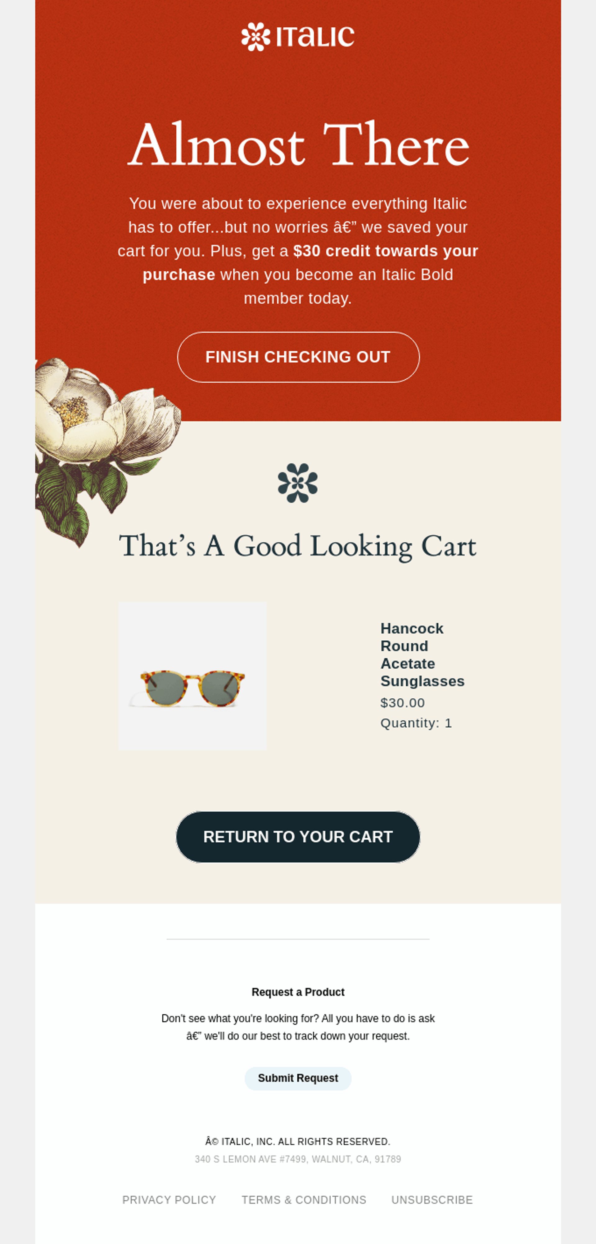 6. Italic: ejemplo de un email de carrito abandonado con un diseño atractivo y en sintonía con el estilo de la marca