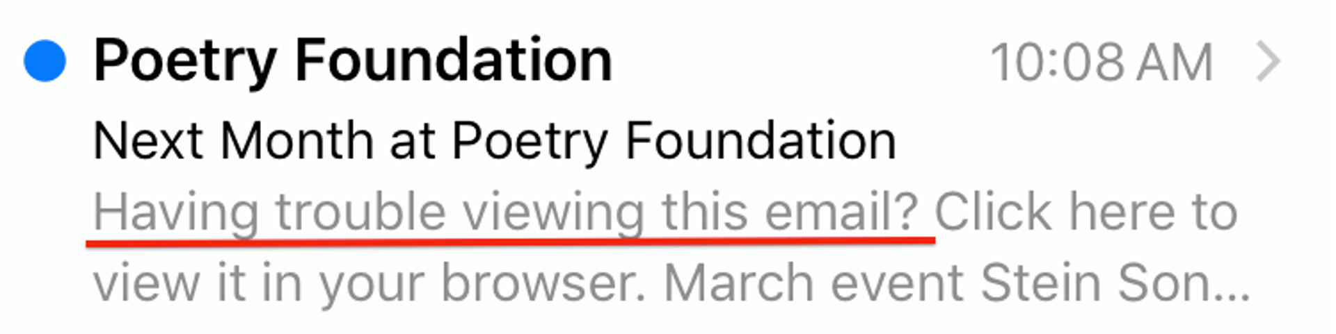 "Tienes un problema" es la primera parte del texto del correo electrónico; entonces, es lo que aparece en el preencabezado. No tenemos nada en contra de Poetry Foundation, pero un preencabezado más descriptivo podría aumentar el índice de apertura. (También podría ser peor, a veces, allí aparece un enlace para cancelar la suscripción).