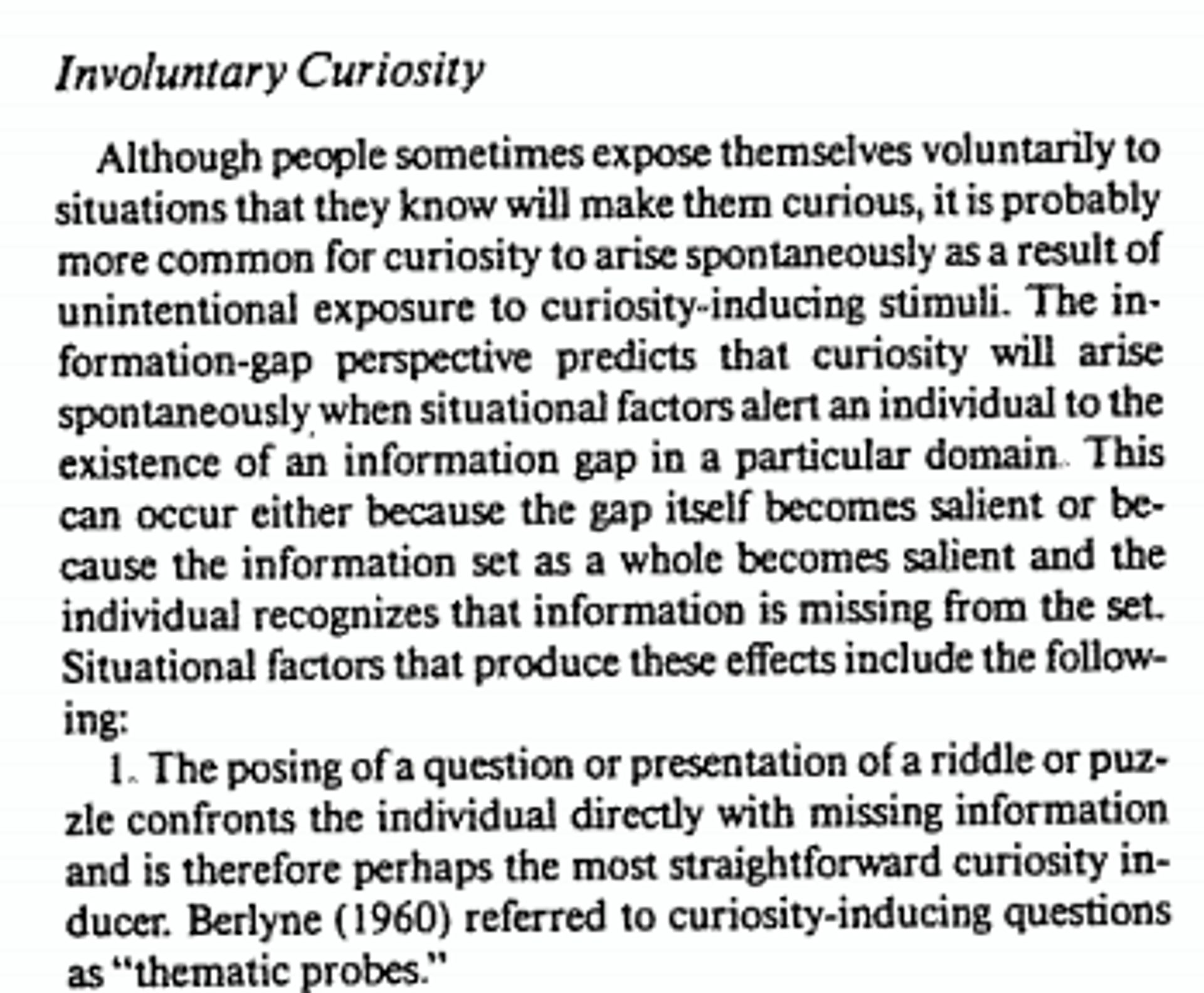 El artículo es un gran análisis de la investigación psicológica sobre la curiosidad. Tiene 24 páginas y ha sido citado más de 1400 veces.
