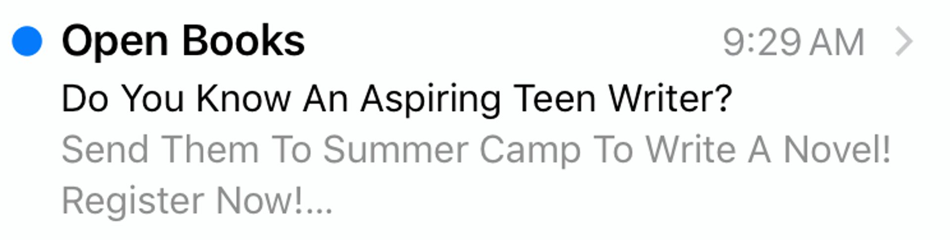 Open Books utiliza el texto del preencabezado como una segunda línea de asunto. En los dispositivos móviles, el preencabezado obtiene más espacio en realidad.