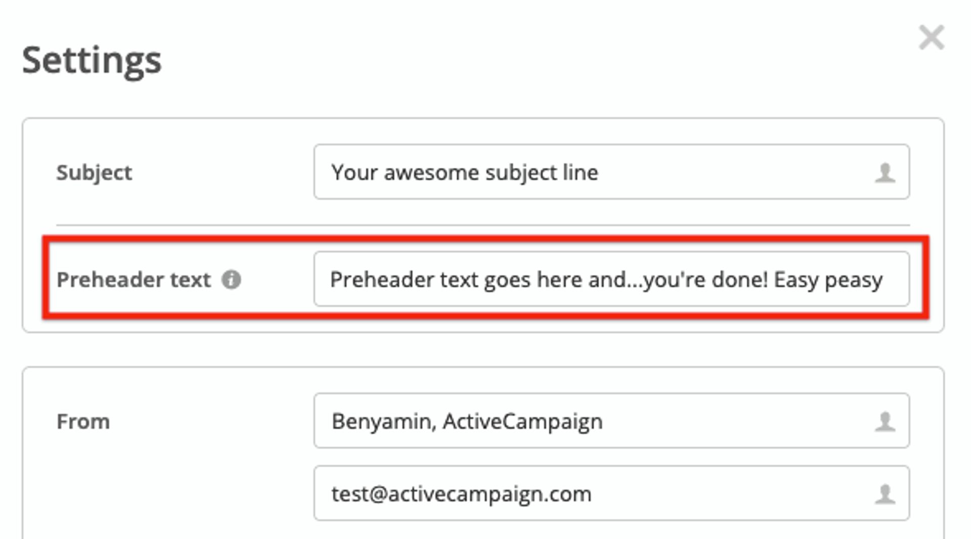 No todos los softwares de marketing automation te permiten personalizar el texto de tu preencabezado sin utilizar un código. En ActiveCampaign, puedes cambiar el texto del preencabezado en el mismo lugar que editas la línea de asunto.