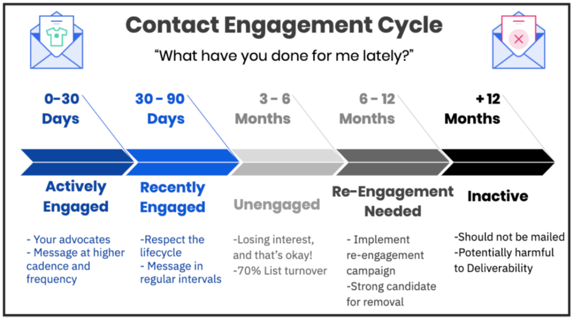 El ciclo de engagement de los contactos es la progresión natural de las interacciones de un contacto con el contenido de su email. El ciclo clasifica los contactos en cinco categorías según la última vez que interactuaron con tus correos electrónicos: