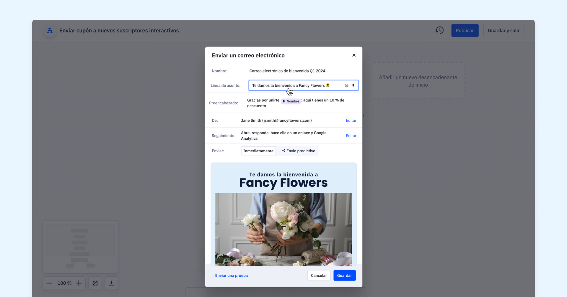 - Edición en contexto de acciones de envío: actualizaremos nuestras acciones de envío para que puedas editarlas directamente en el creador de automatizaciones sin tener que salir de tu flujo de trabajo. Esta edición en contexto agiliza tu proceso de automatización de correos electrónicos, mensajes SMS y notificaciones internas, lo que te permite mantener la concentración y tu flujo creativo dentro del creador de automatización.