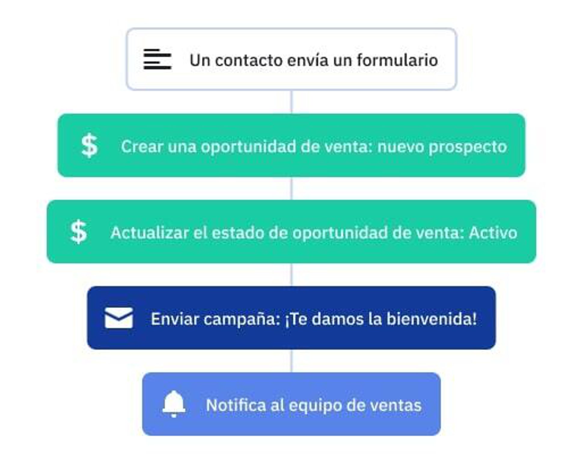 Por ejemplo, cuando un cliente se registra, todos los datos se guardan automáticamente en el CRM. Como primer paso, puedes programar una serie de emails de bienvenida. Y posteriormente, con la ayuda del marketing automation, enviar campañas de marketing para nutrir a tus leads y que, al llegar a un puntaje determinado, se notifique al equipo de ventas. Todo esto mientras tú te ocupas de otras tareas.