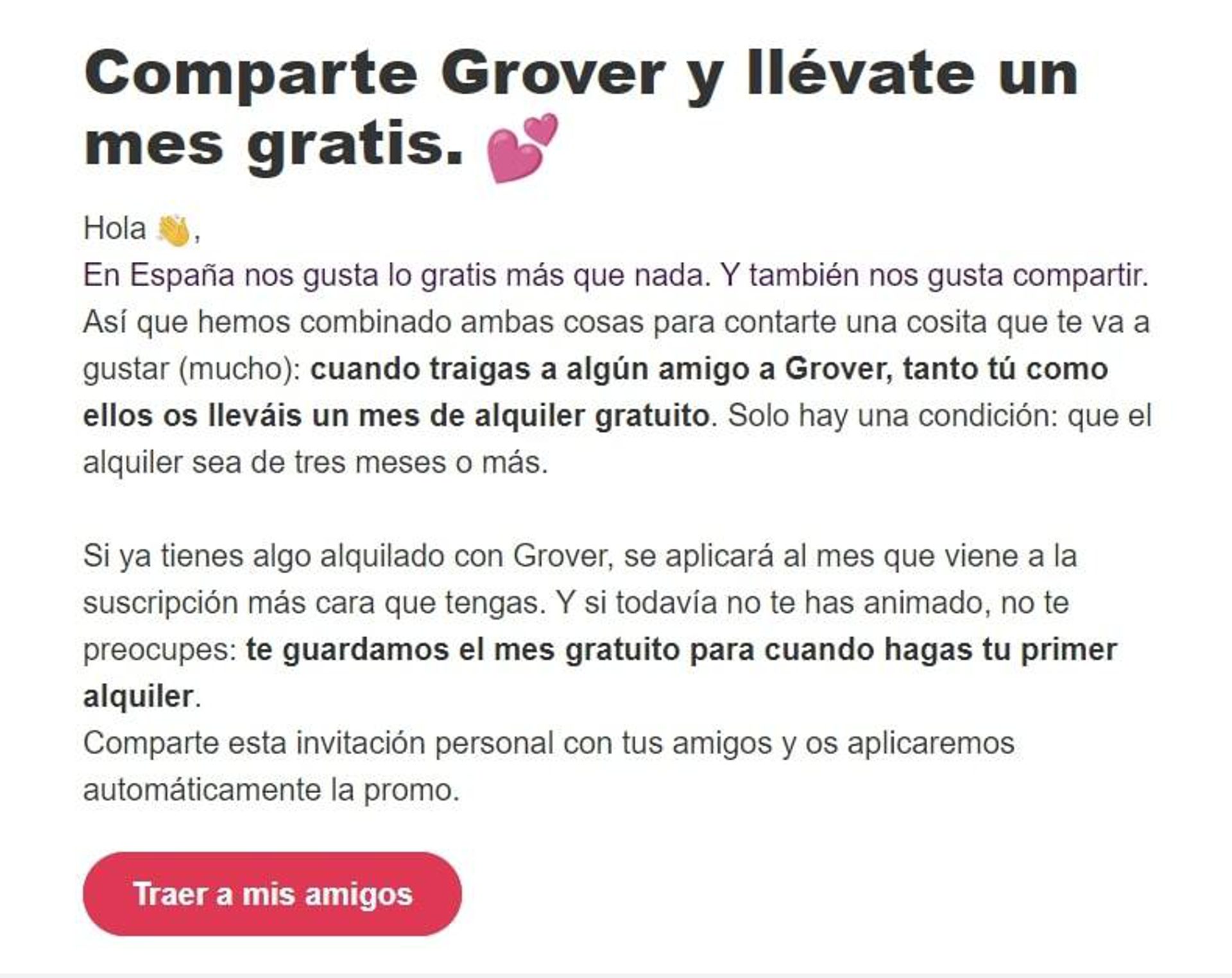 Como parte de su programa de fidelización, una vez que eres cliente, Grover te da la opción de llevarte un mes de alquiler gratis cuando consigues que una persona referida también alquile.