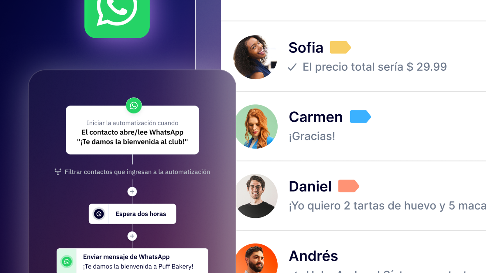 - Las automatizaciones integradas de la API de WhatsApp Business se encargan de la programación, los desencadenantes y el enrutamiento para que los equipos no deban realizar ninguna intervención manual.