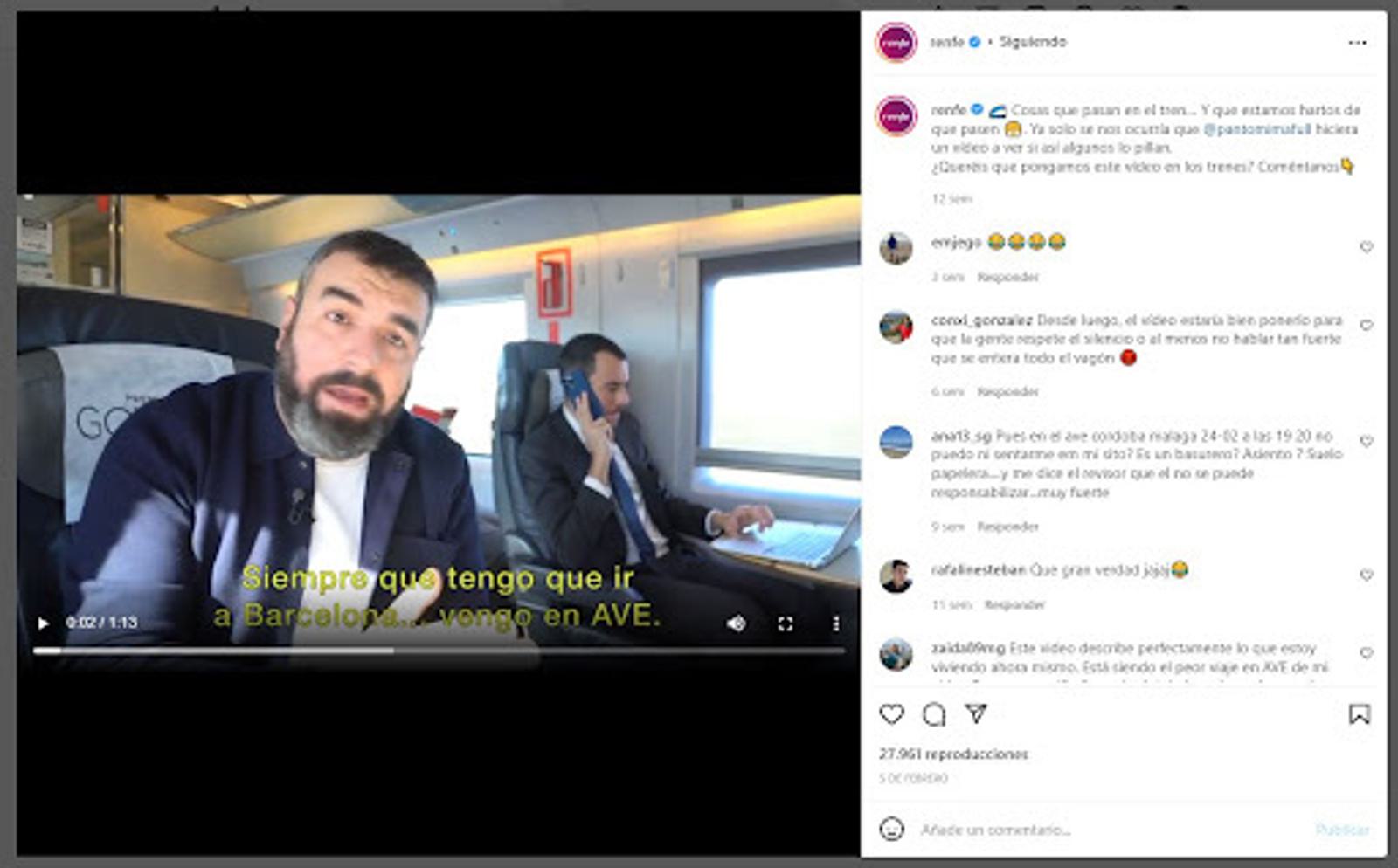 El contenido publicado en los perfiles de social media de Renfe está dirigido a mejorar su reputación online. Para lograrlo, han echado a andar una estrategia que incluye vídeos cortos y colaboraciones con caras conocidas del país para hablar de temas no directamente relacionados con la compra de un billete o una oferta comercial.