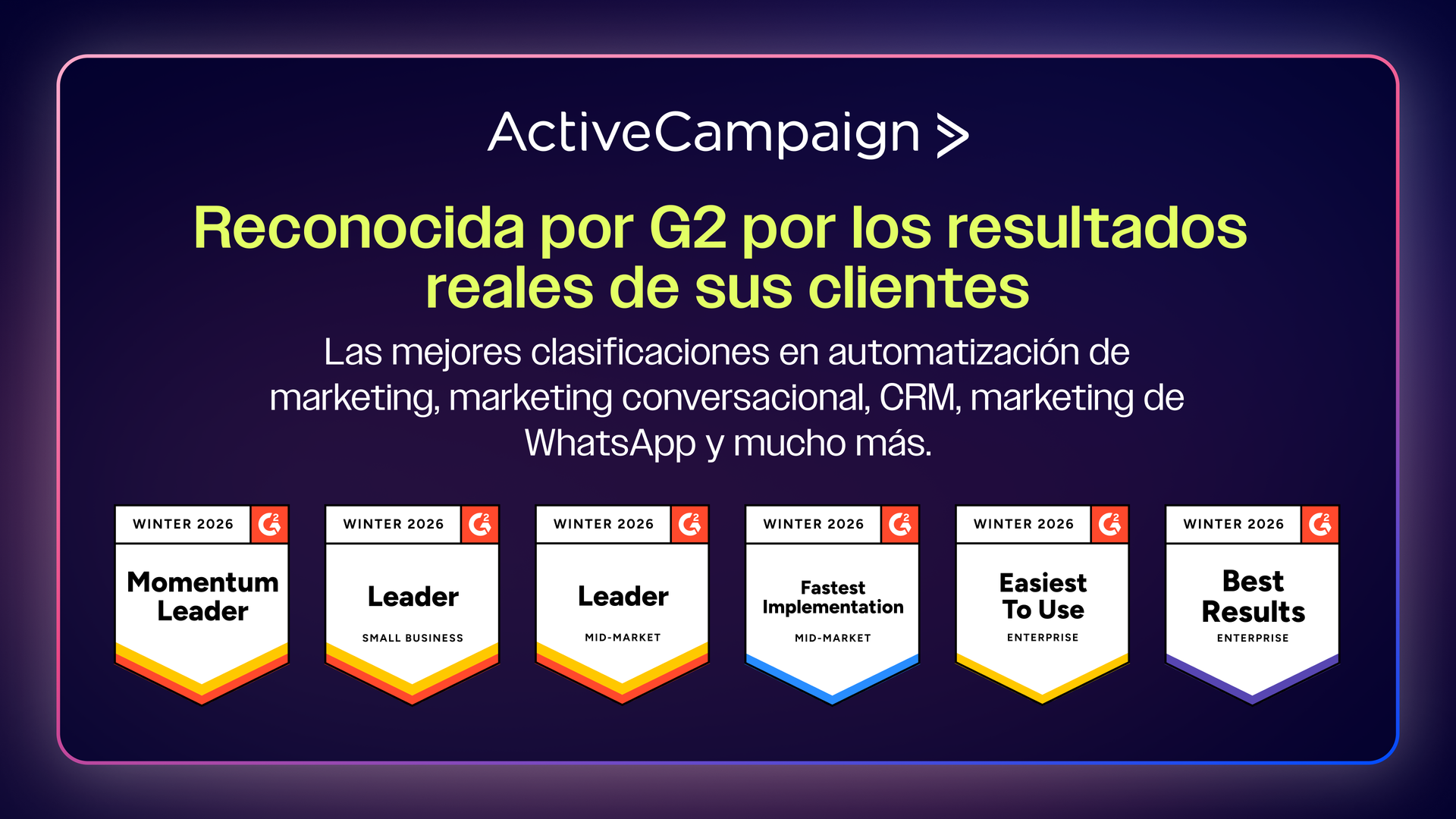 ActiveCampaign ayuda a las empresas a automatizar el marketing, gestionar las relaciones con los clientes y obtener resultados reales. Los informes de invierno de 2026 de G2 destacan cómo nuestra plataforma ofrece valor a través de industrias y equipos.