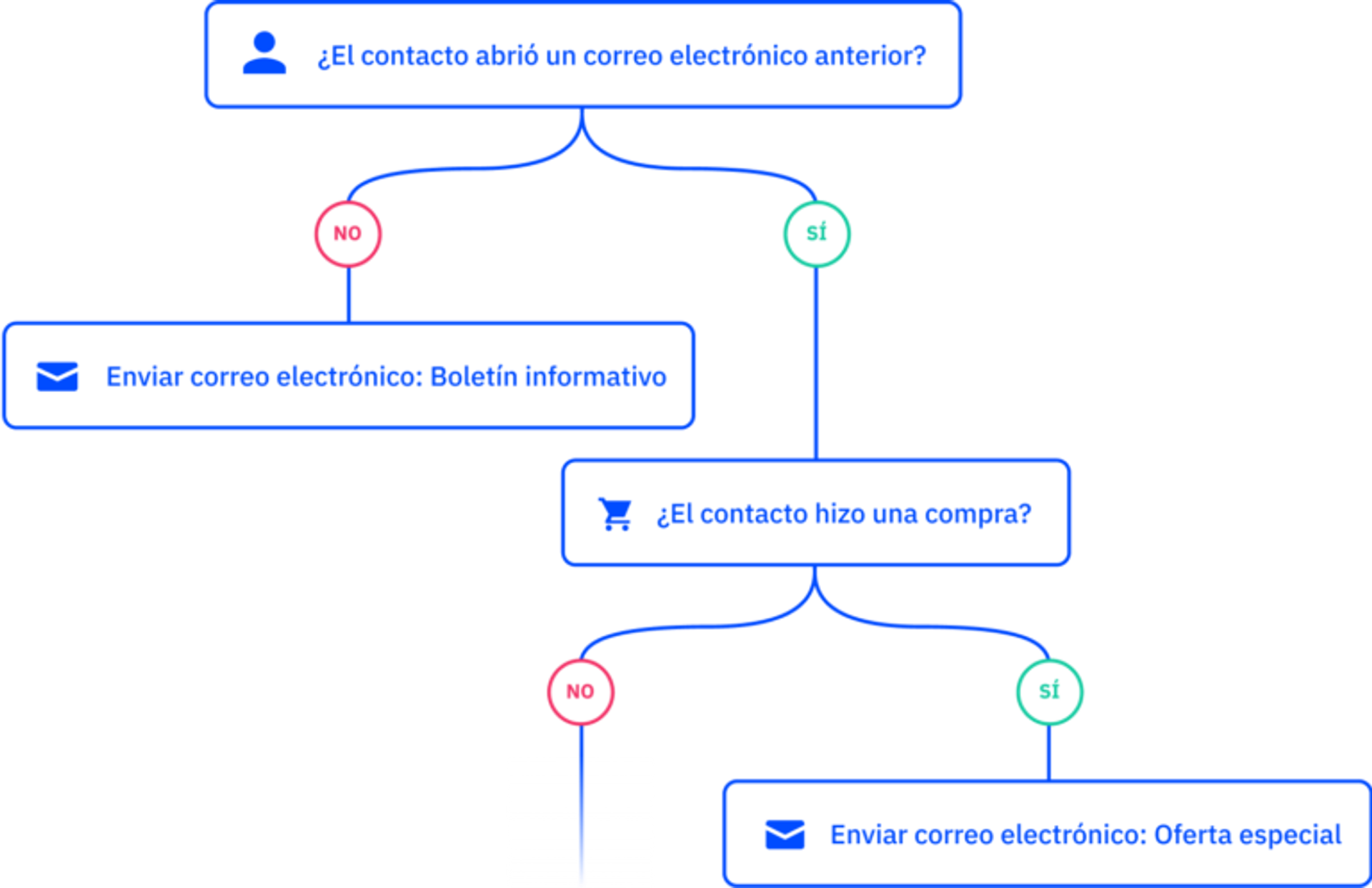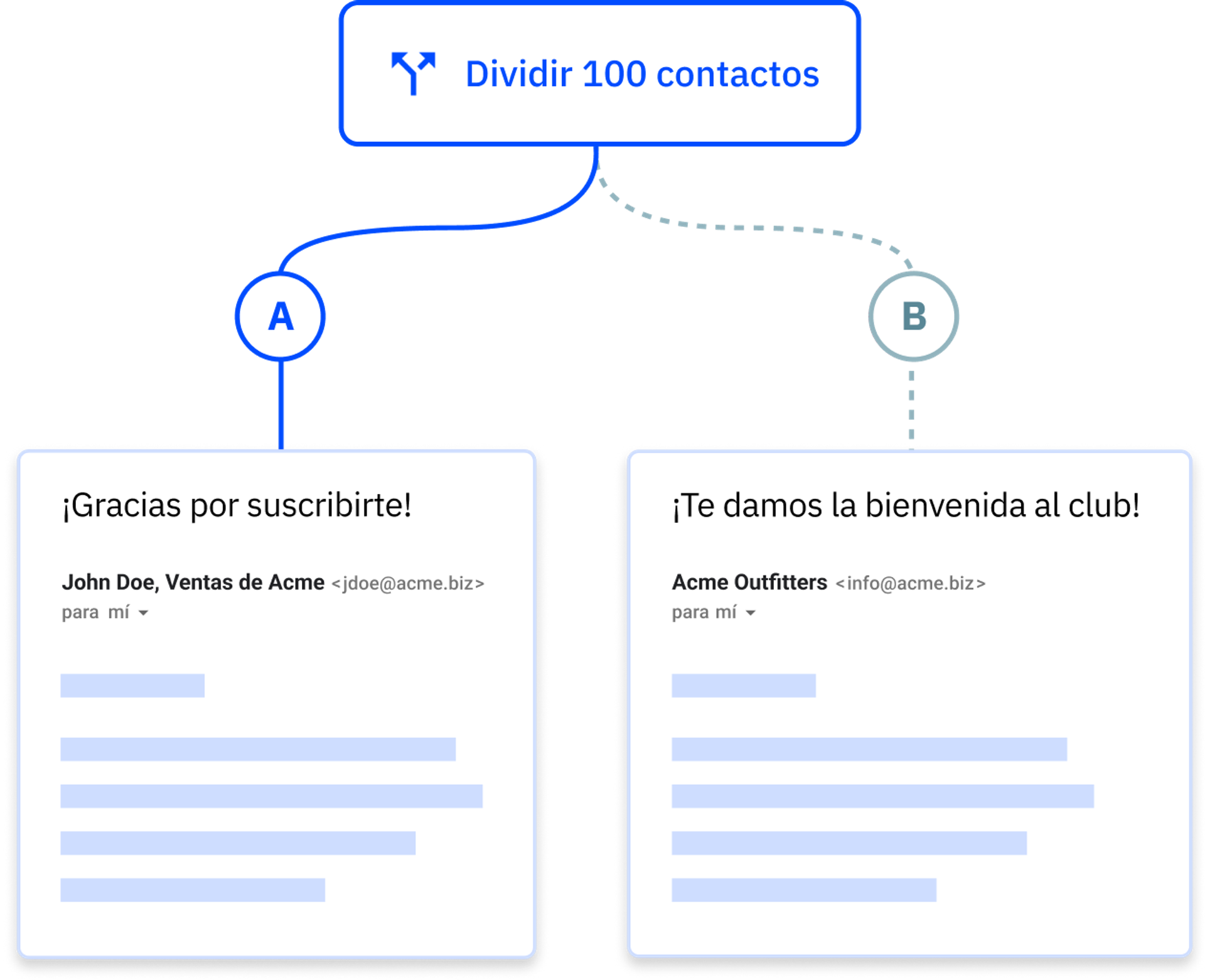A modo de ejemplo, digamos que dos personas se suscriben a tu lista de correo electrónico y reciben un mensaje de bienvenida. Si una persona interactúa con ese mensaje, puedes enviarle otro correo electrónico automatizado con un descuento para un producto que estuvo viendo. Si la otra persona no interactúa con el mensaje, es posible que quieras que el sistema automatizado le envíe una versión distinta del correo electrónico de bienvenida, con un título y una redacción diferentes.