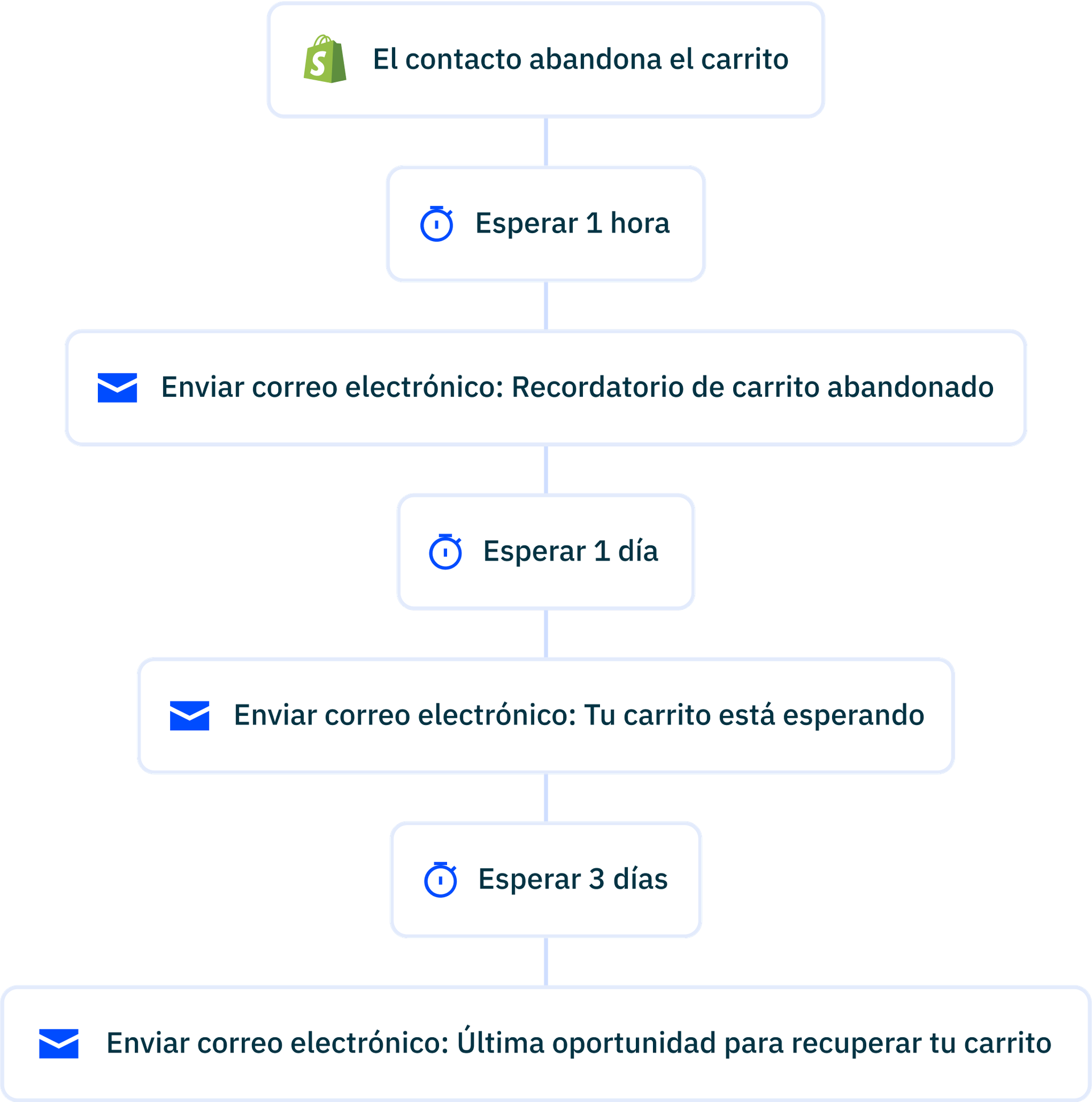 Como todos los formularios de marketing automation, la automatización de correo electrónico requiere cierto trabajo previo. Deberás determinar tus embudos y qué clientes pertenecen a cada uno para cubrir las bases y evaluar todos los casos en los que puedas automatizar los correos electrónicos. Por ejemplo, un correo electrónico de bienvenida cuando alguien se suscribe a tu lista de correo electrónico o un correo electrónico de carrito abandonado cuando alguien abandona un artículo sin comprarlo.