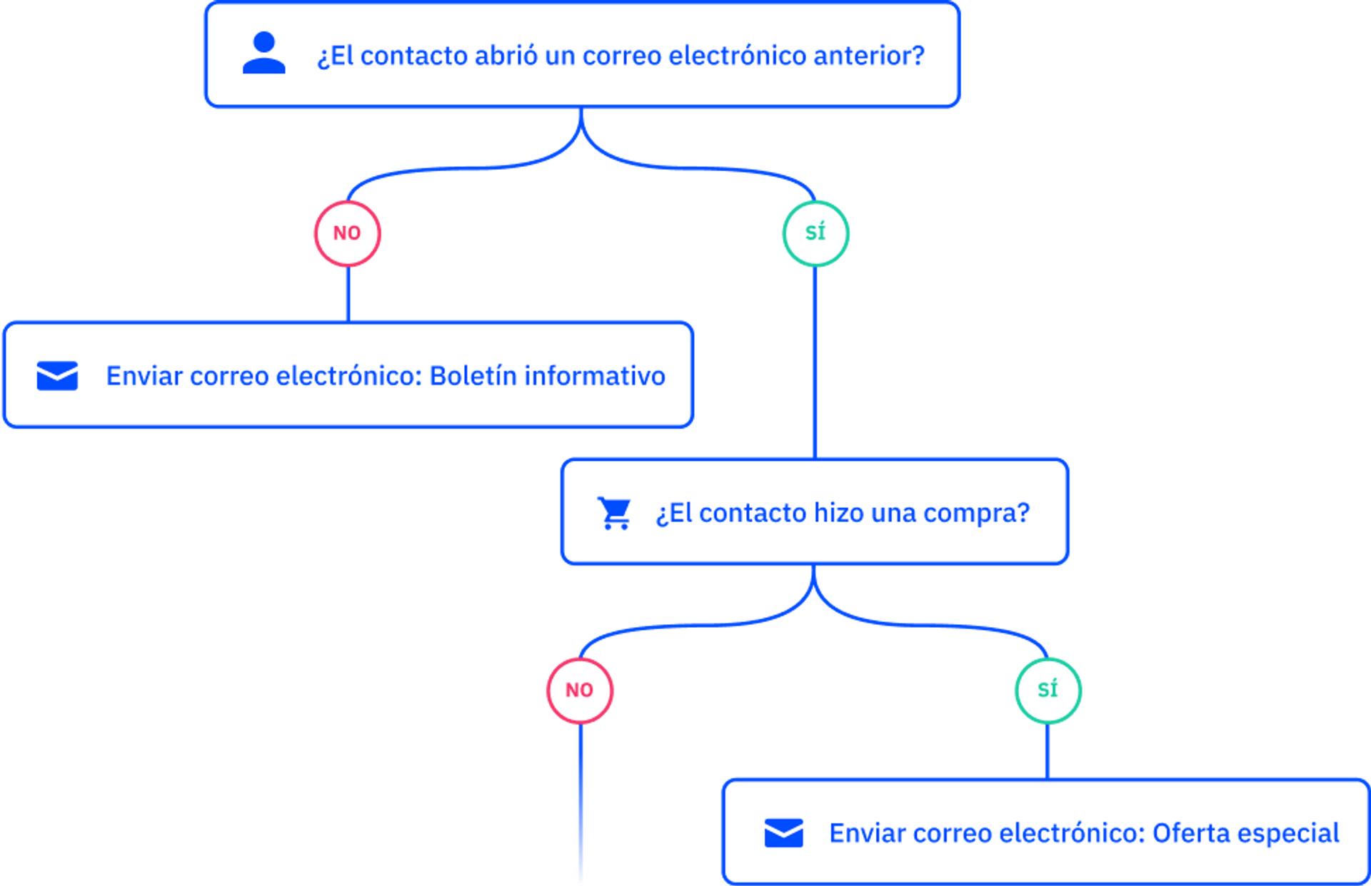 Supongamos que tienes una tienda de ecommerce de artículos para el hogar y un cliente compra un juego de platos. Puedes configurar una automatización que lleve a cualquier persona que haya comprado platos a un flujo de trabajo que siga con una oferta o una venta adicional de tazones y tazas. El cliente recibe información relevante y tú tienes más posibilidades de realizar otra venta.