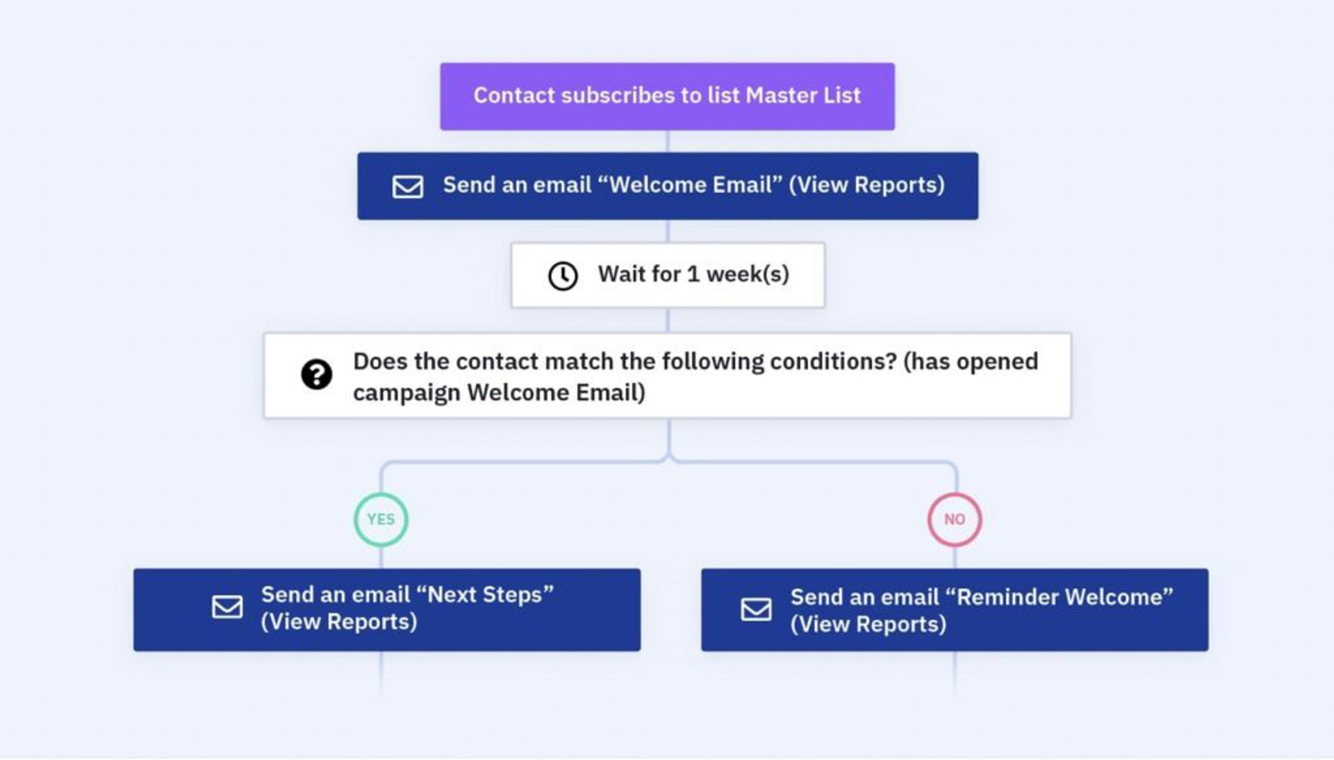 Ejemplo de árbol de workflow para el envío de un mensaje de bienvenida. Fuente: ActiveCampaign.