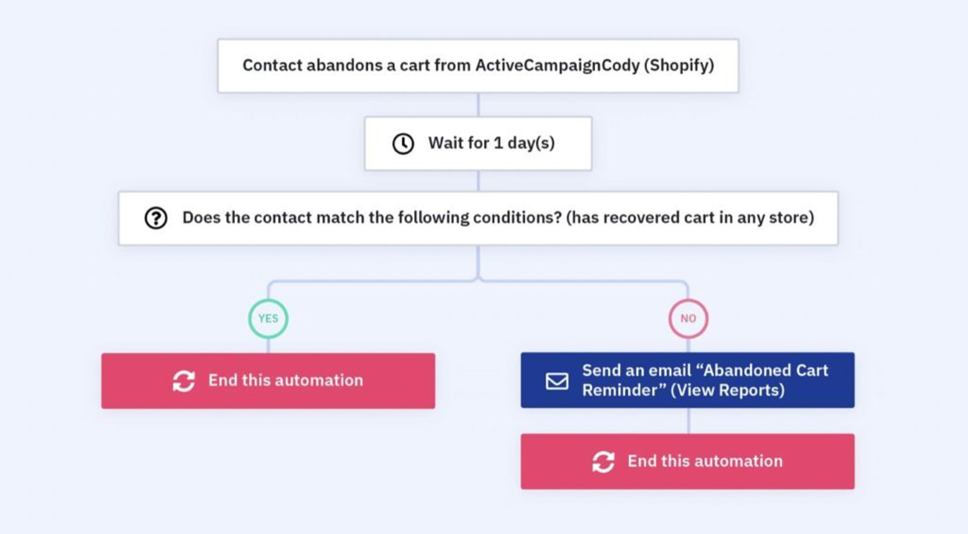 Ejemplo de árbol de workflow para el envío de un mensaje de recuperación de carrito abandonado. Fuente: ActiveCampaign.