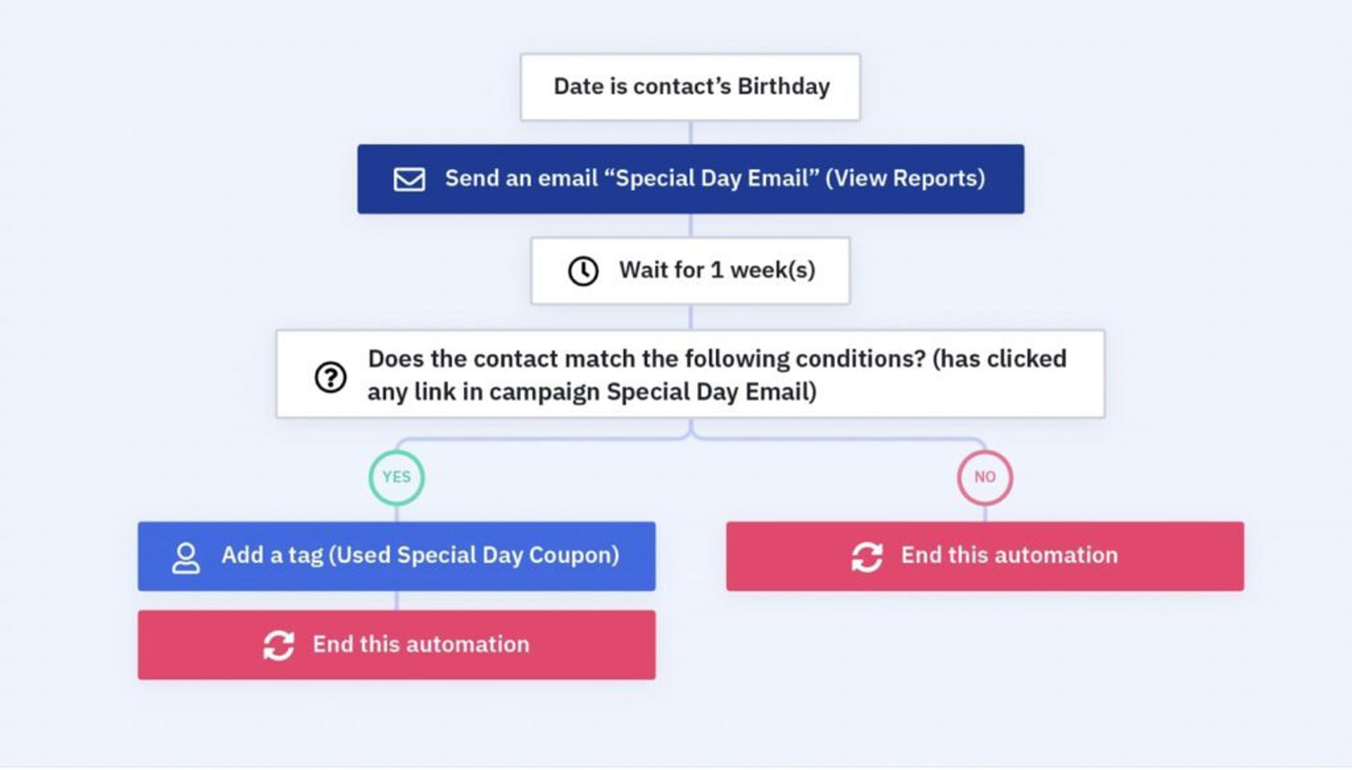 Ejemplo de árbol de workflow para el envío de un mensaje de felicitación de cumpleaños. Fuente: ActiveCampaign.