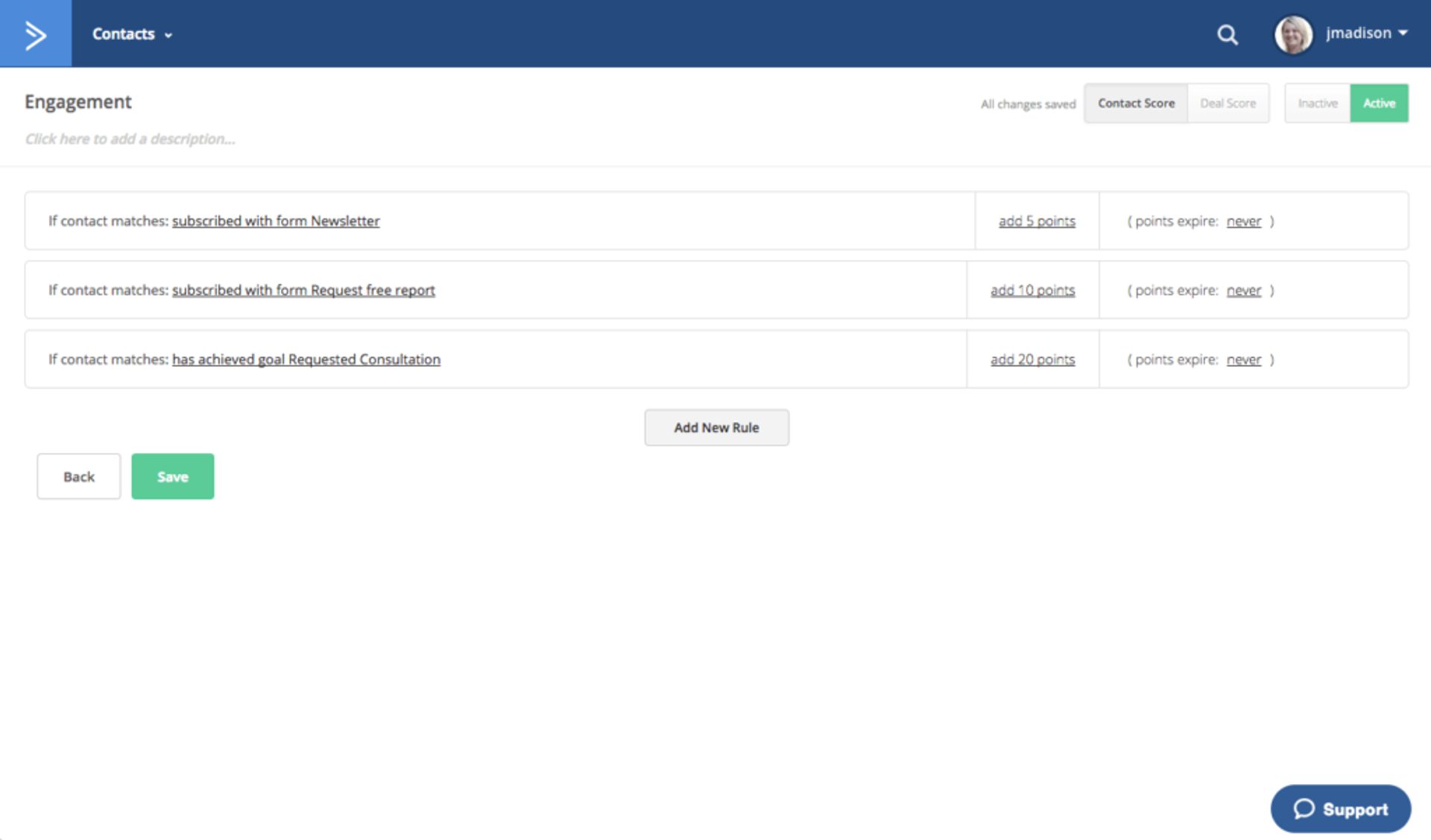 Creación de reglas para asignar puntos de lead scoring a las interacciones de los clientes y clientes potenciales con la empresa. Fuente: ActiveCampaign.