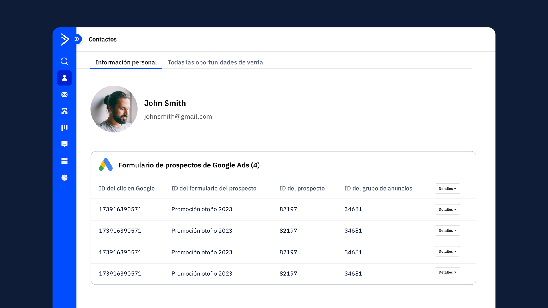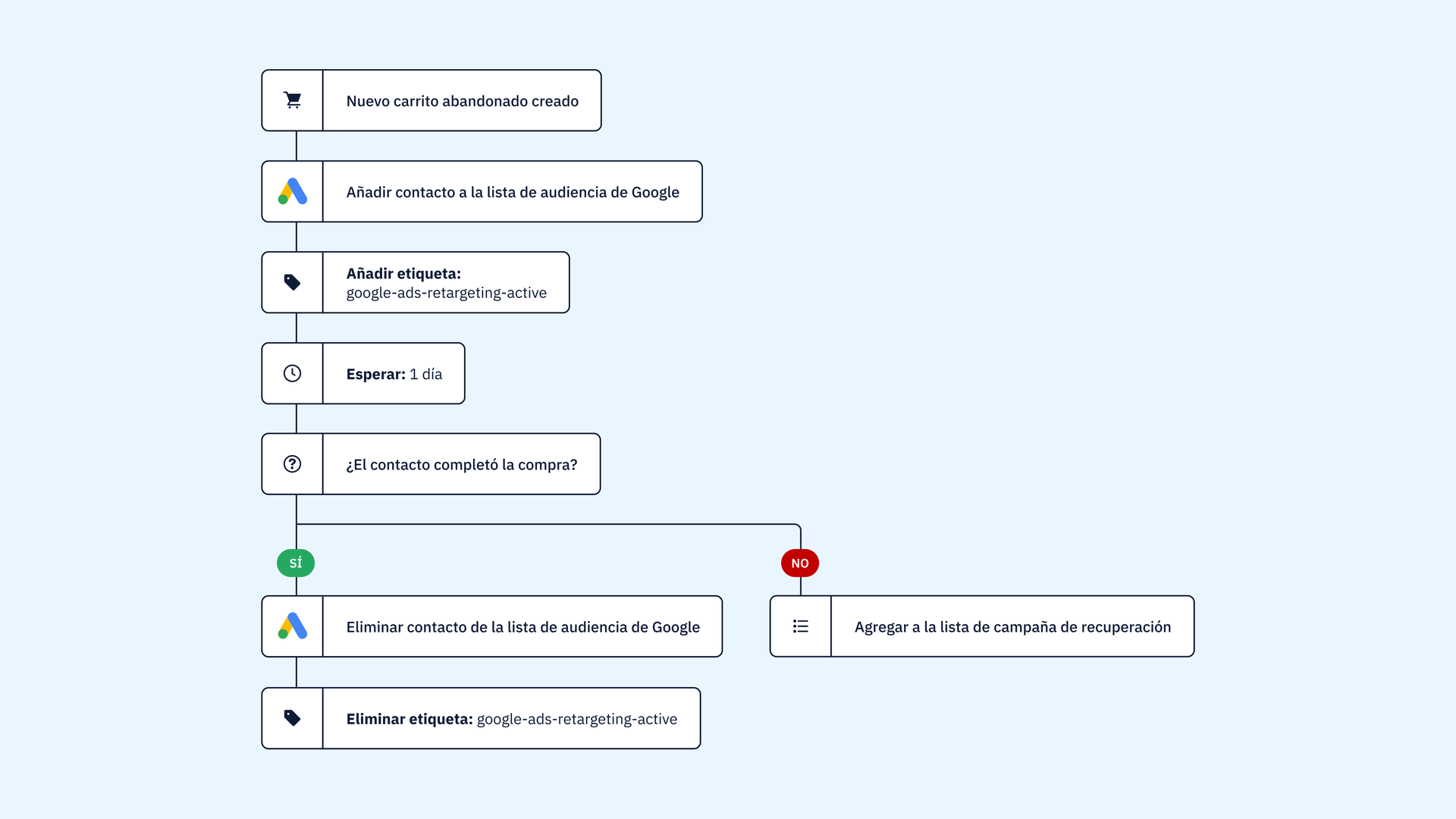 Profundiza las relaciones con los clientes- Promueve las relaciones a largo plazo y fomenta la lealtad a la marca al cuidar a los prospectos según sus comportamientos e interacciones. Puedes adaptar los puntos de toque que resuenen con tu audiencia. Al conectarte con Google Ads, puedes ampliar el alcance y ofrecer anuncios personalizados para aumentar las conversiones a través de experiencias atractivas. La integración les proporciona a las empresas herramientas eficaces para volver a atraer clientes, llegar a los visitantes del sitio web y reactivar clientes inactivos mediante campañas y contenido dirigidos.
