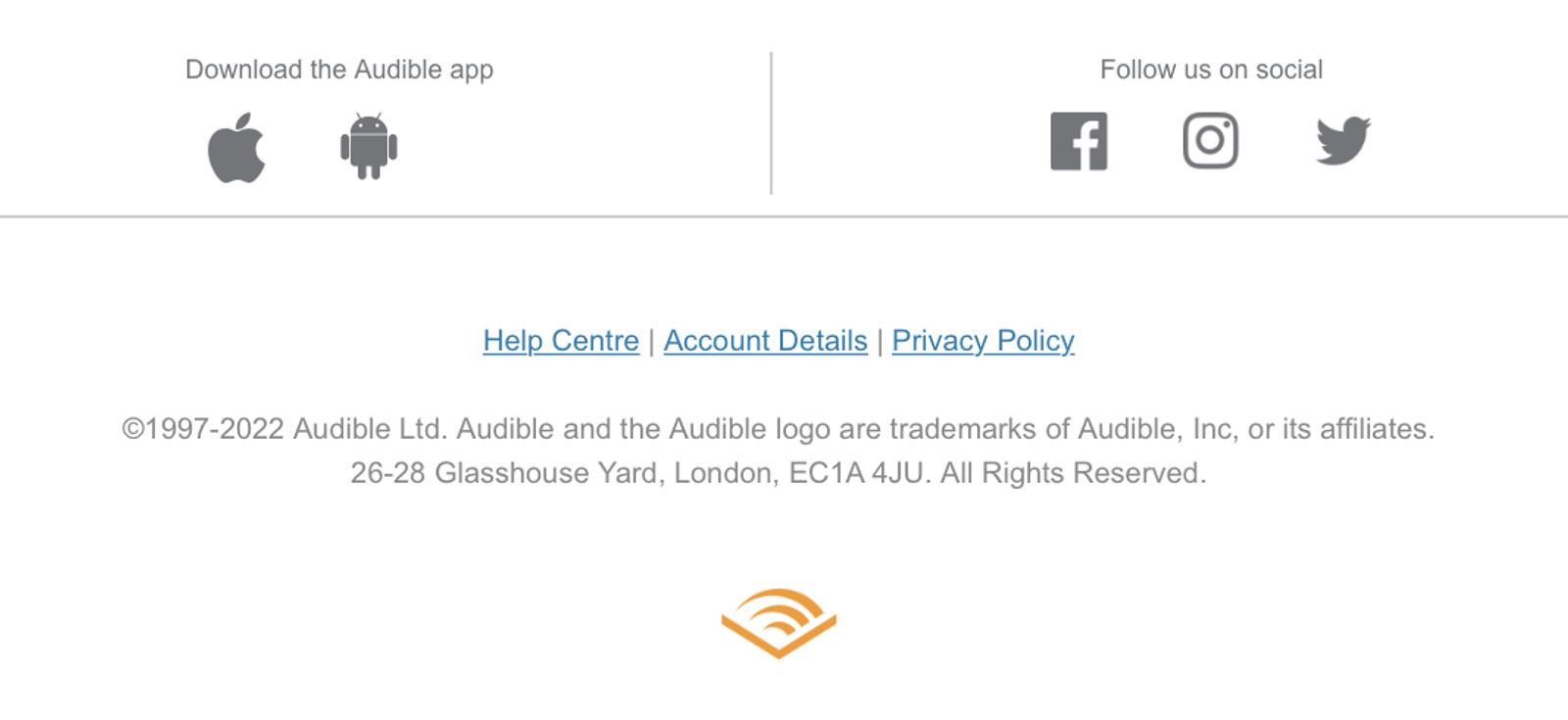 Pie de email de la compañía Audible. Fuente: Audible.