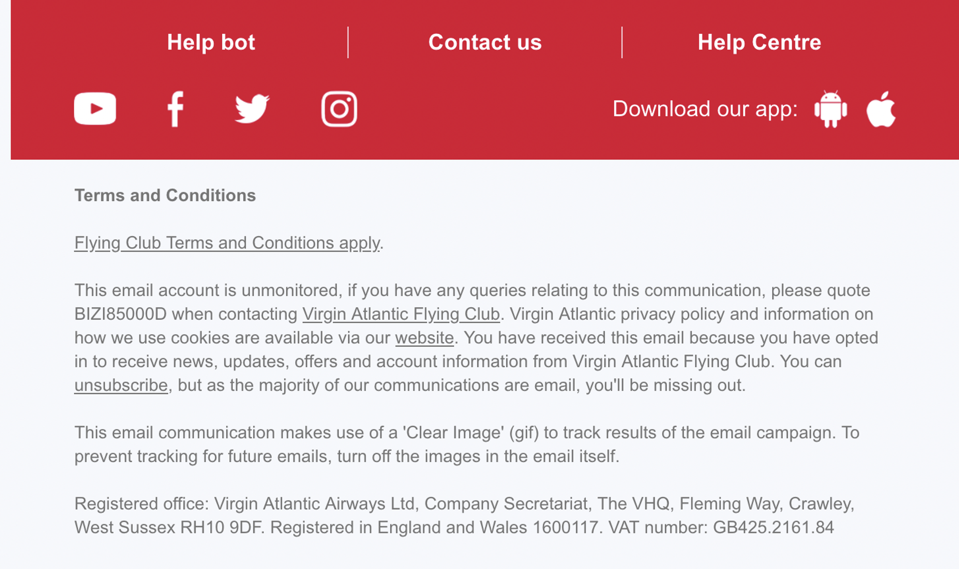 En sus correos electrónicos, la empresa Virgin Atlantic incluye varios enlaces para ampliar información que puede ser de interés para sus clientes. Fuente: Virgin Atlantic.