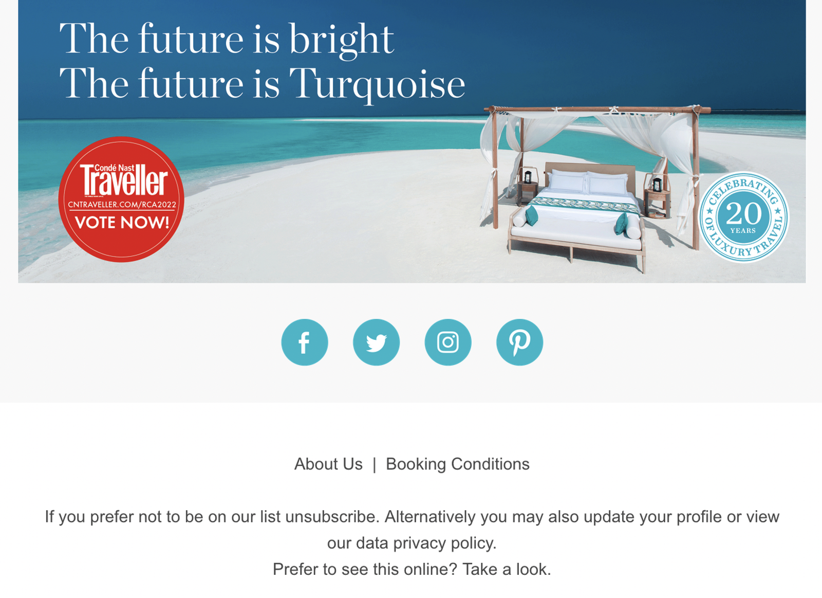 Una sola palabra: impecable. Así es el pie de email de una empresa que promete vacaciones de lujo. En la foto que incluyen aprovechan para resaltar su experiencia (20 años en el mercado) y pedir a los clientes que voten por ellos en una encuesta en línea.