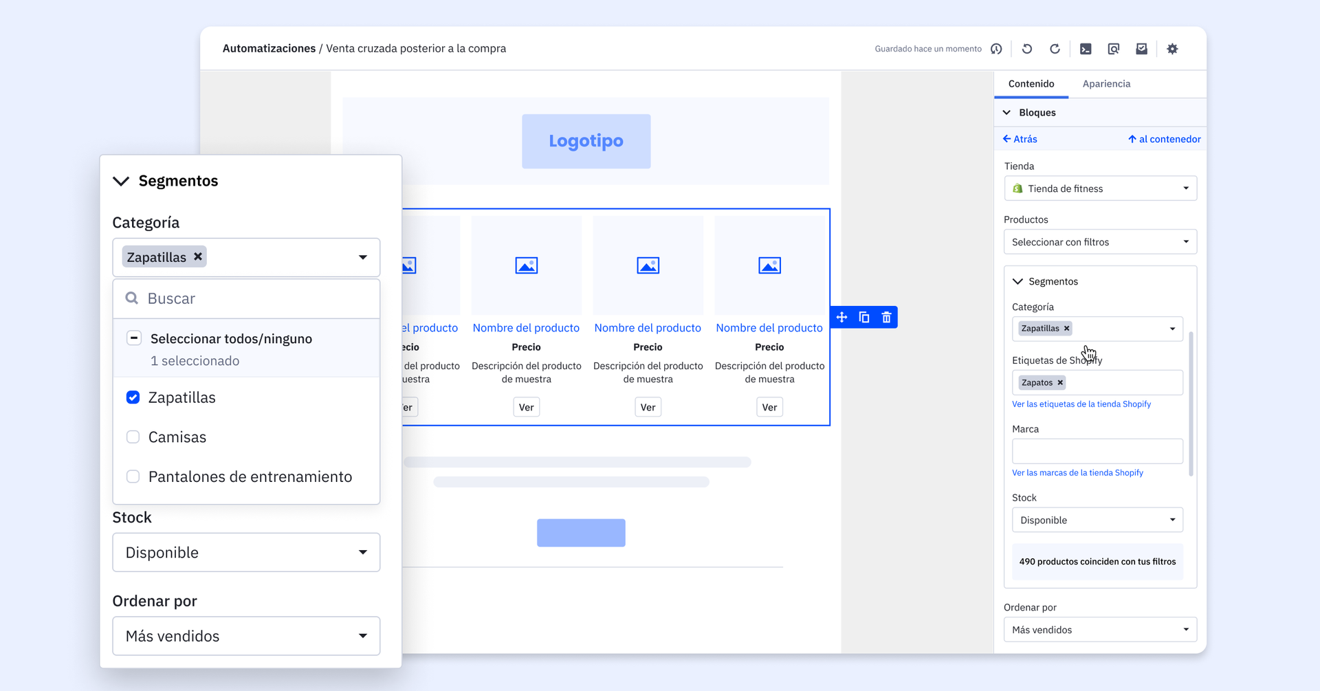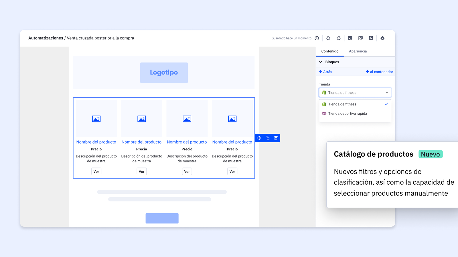 Utiliza la segmentación avanzada en el editor de correo electrónico; puedes elaborar correos electrónicos dirigidos basados en los intereses de tu audiencia, su perfil, ubicación y comportamientos de navegación, y rellenar con los productos que más probablemente compren. Incorpora información relevante de productos a través de varios filtros y capacidades de clasificación de productos, o selecciona manualmente los productos que deseas destacar en una campaña de correo electrónico dirigida para segmentos de clientes exclusivos. Puedes filtrar y clasificar tu contenido de productos conforme a lo siguiente: