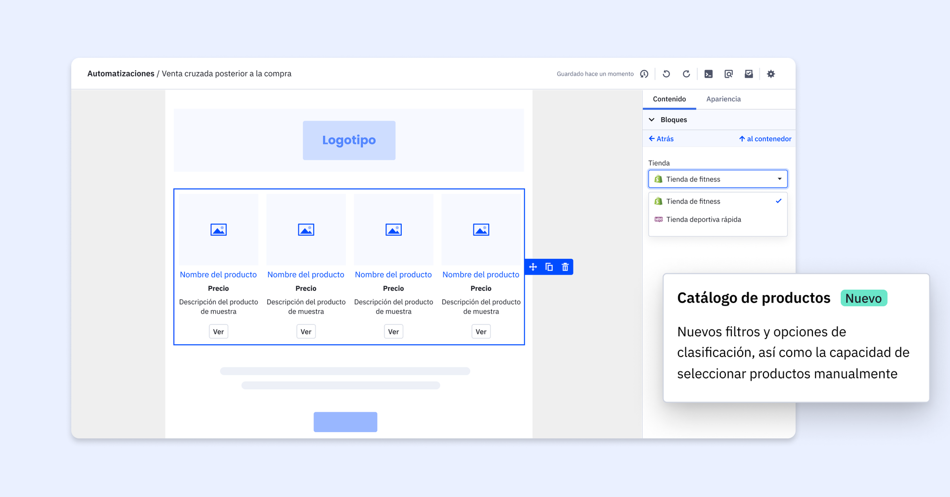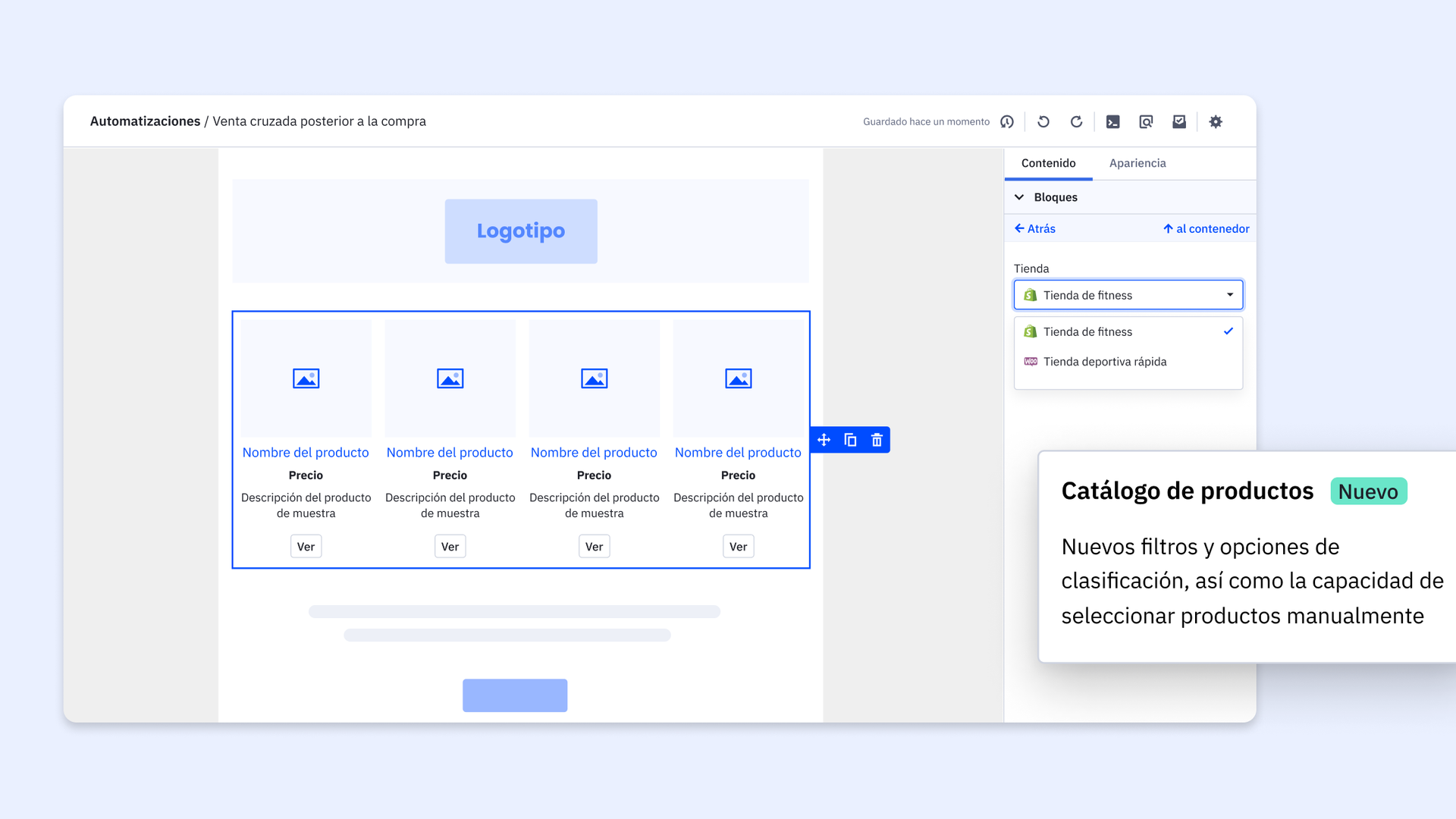 A lo largo del año, hay muchas oportunidades de promover tu tienda en línea: desde lanzamientos de productos nuevos y reposición de productos más vendidos hasta eventos de venta por festividades o aniversarios y más. El email marketing es una forma efectiva de llegar a tu público con contenido personalizado relevante que pueda ayudar a impulsar tus ventas y, al mismo tiempo, promociona tu marca. Si usas Shopify o WooCommerce, ActiveCampaign te ayuda a optimizar tu estrategia de marketing automation. Sincroniza tus ofertas de productos de la tienda en línea para crear campañas dirigidas y automatizaciones que capitalicen los lanzamientos de productos nuevos, la venta cruzada y las oportunidades de ventas adicionales durante todo el año.
