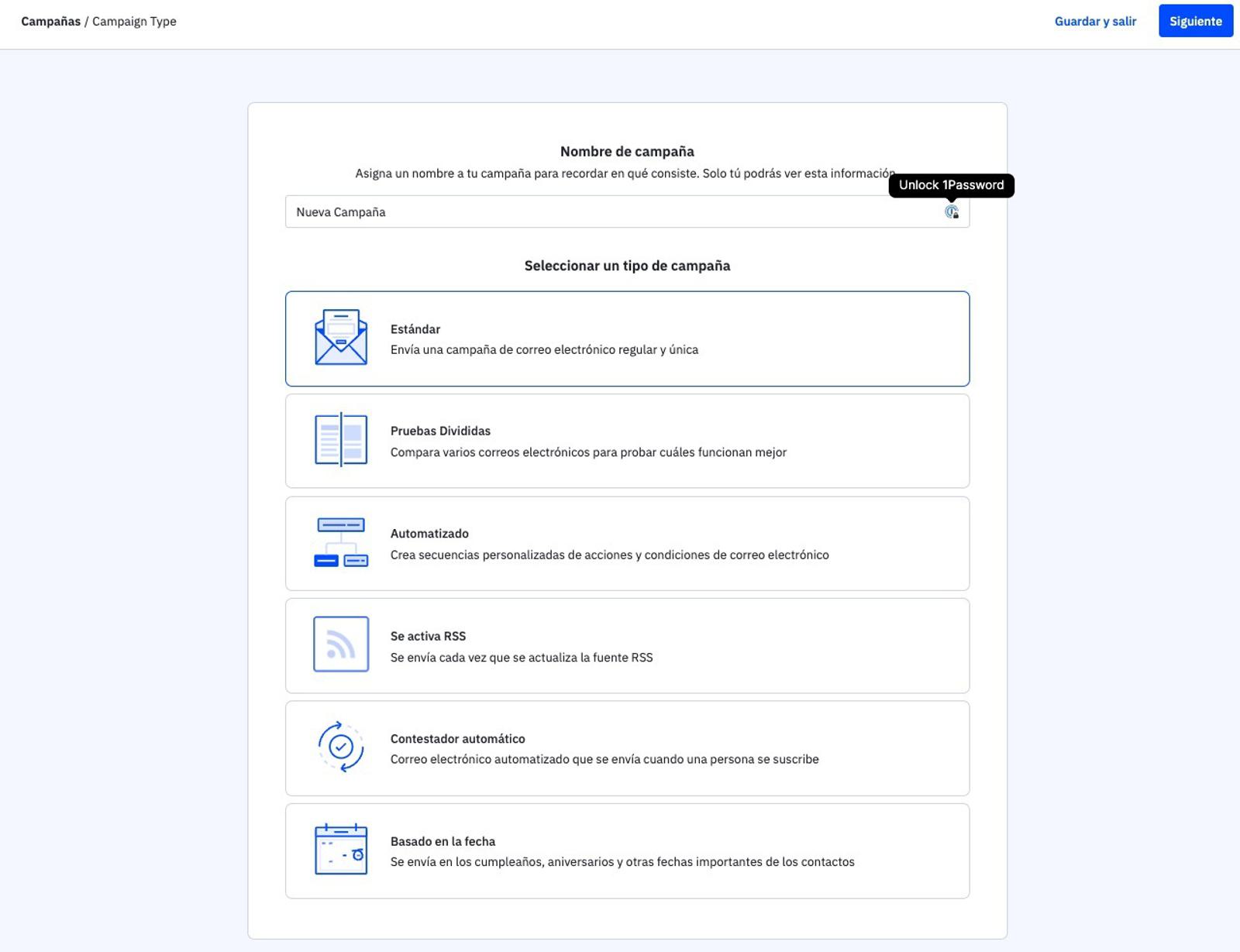 En lugar de crear una campaña estándar o de respuesta automática, elige el tipo de campaña «pruebas a/b» para crear tu prueba.
